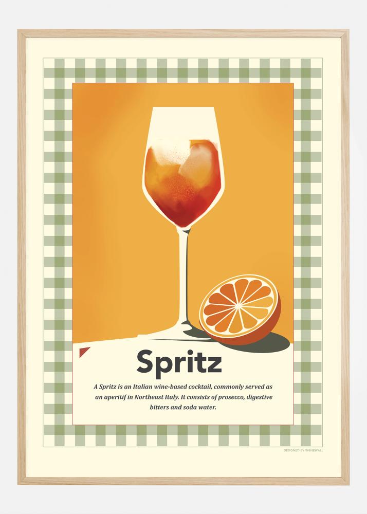 Pro všechny, kteří touží po tom pocitu dovolené, představujeme plakát, který vás přímo přenese na slunné terasy severní Itálie. Náš retro inspirovaný Spritz plakát oslavuje klasický aperitiv s ilustrací, která vyzařuje teplo a radost. Oranžové odstíny sklenice proti drzému, zeleně kostkovanému pozadí vytvářejí dojem, který je jak vintage, tak nadčasový.