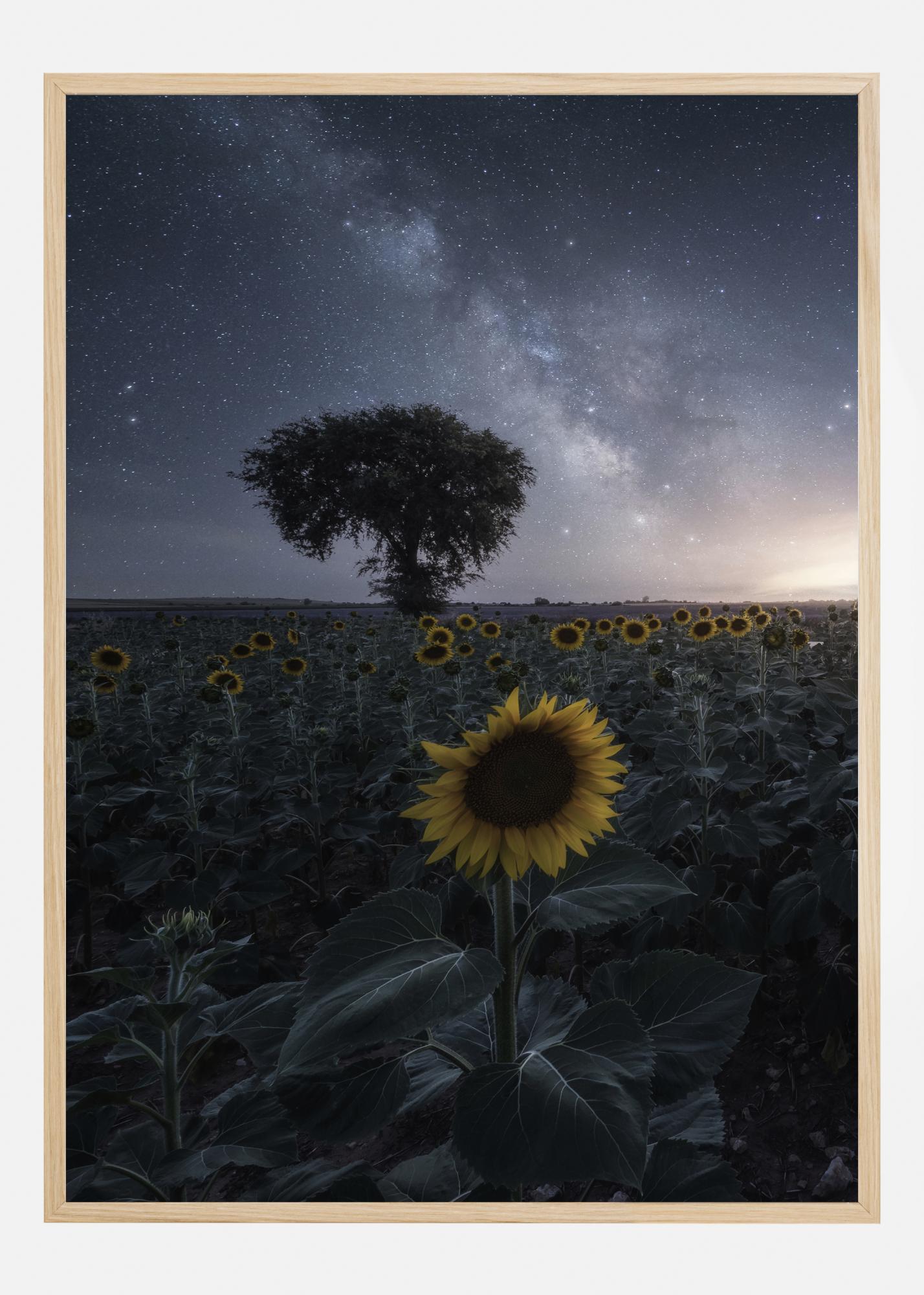 Květinový plakát se slunečnicemi v noci. Pole slunečnic drží světle žluté květy proti noční obloze. Toto se odráží v západu slunce v dálce, který stále osvětluje květiny, ale také osvětluje oblohu tak, že hvězdy mohou být vidět. Mystika je v tomto pohledu hojně přítomna.