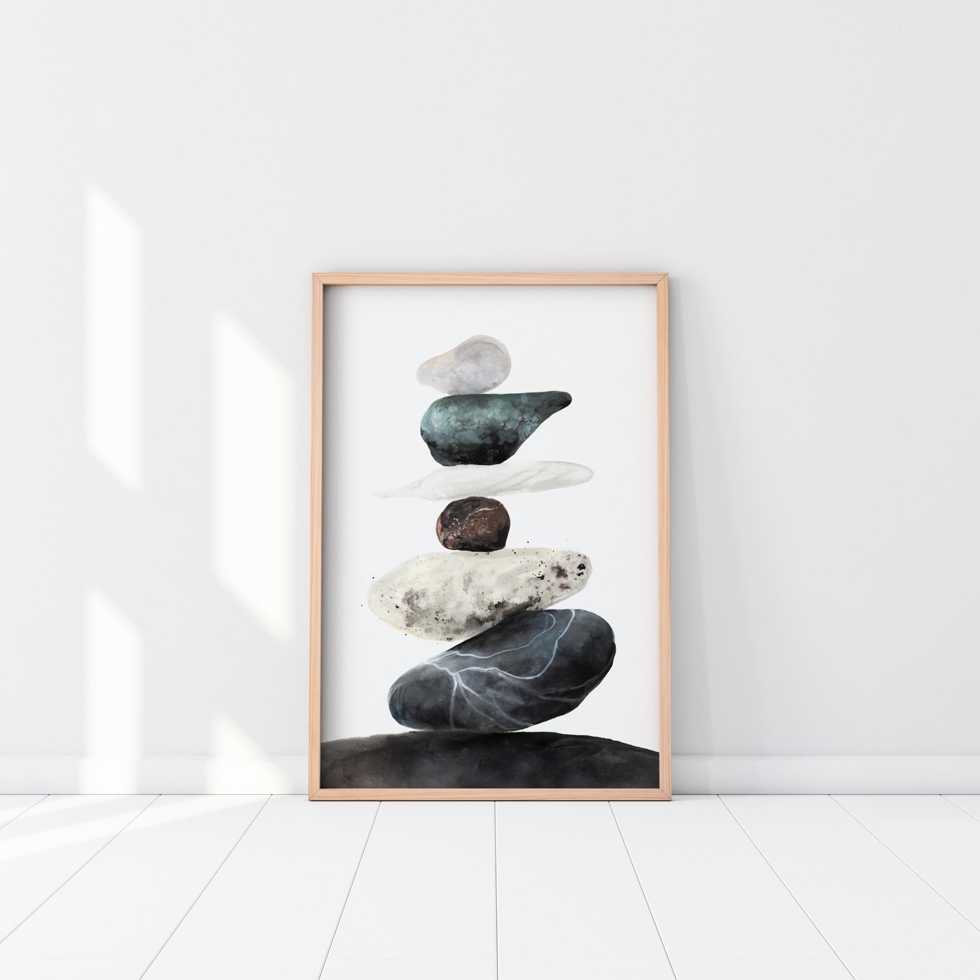 Elegantní umění kamenů malovaných v krásně kontrastních tónech, vytvořené Emelie Bengtsson (EMELIEmaria). Klidný a harmonický plakát, který se snadno kombinuje s dalšími oblíbenými kousky na větší stěně s obrazy. Hodí se do většiny domovů a interiérových stylů.