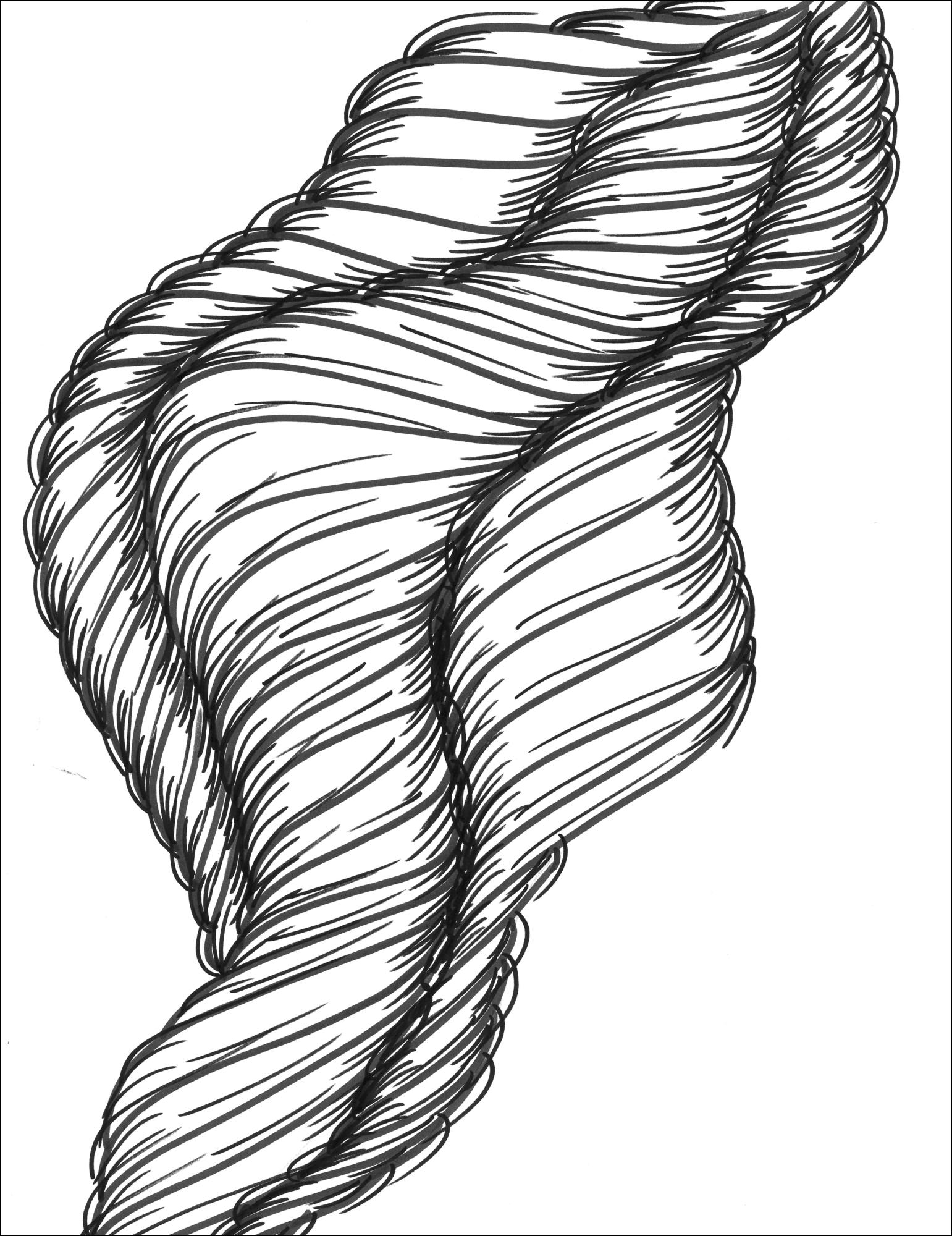 Abstraktní plakát s vířícími černými liniemi, které se proplétají a vytvářejí tvar tornáda. Tři černé spirály linií se stáčejí dohromady na bílém pozadí. Tlusté a tenké čáry vytvářejí téměř pohyblivý obraz, který vede oko, když se pohybuje po díle.