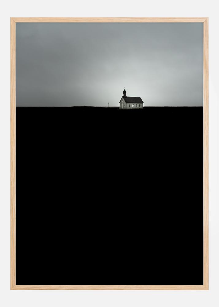 Tento plakát nabízí silný a atmosférický obraz Strandarkirkja, osamělého kostela stojícího proti dramatické obloze. Temná silueta krajiny vytváří ostrý kontrast s šedou oblohou, což vyvolává pocit izolace a klidu. Bílé stěny kostela září v krajině a nabízejí symbol naděje a vedení v okolní tmě.