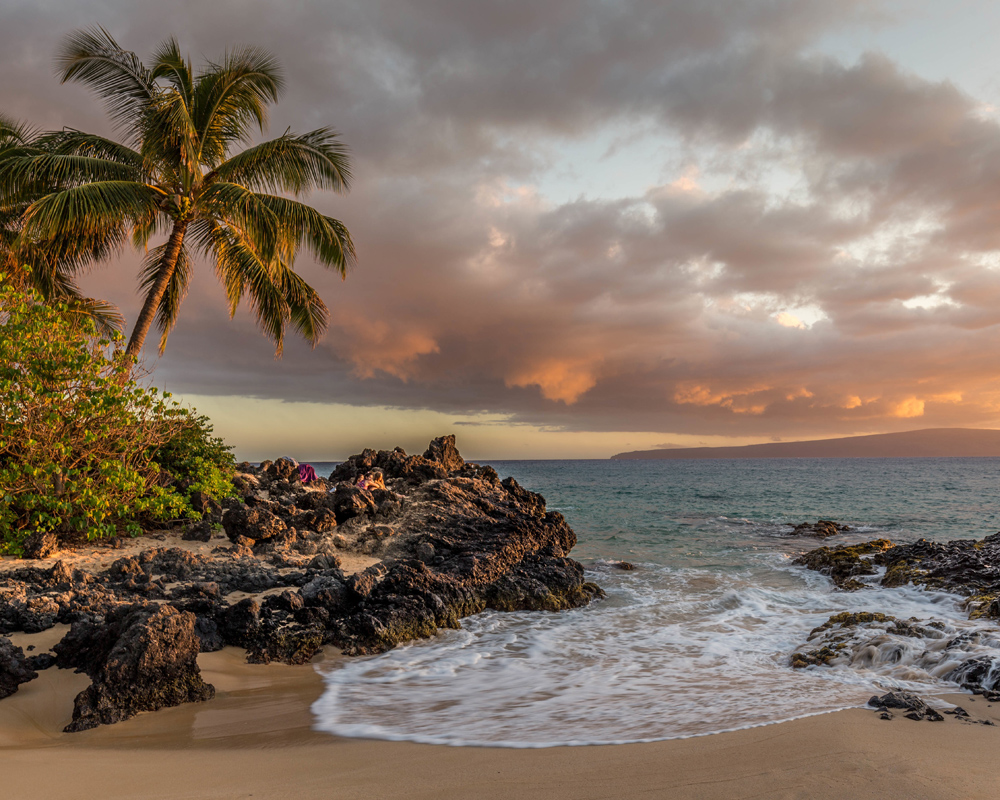 Pláž při západu slunce, krásné klišé, které je nutností pro milovníky tiki nebo tropického tématu. Plakát s klasickou palmou, která se naklání nad okraj pláže v posledních zlatých paprscích dne. Fotografie se bude dobře vyjímat v rámečku s opotřebovaným vzhledem nebo v jasné barvě, aby ladila s tiki výzdobou.
