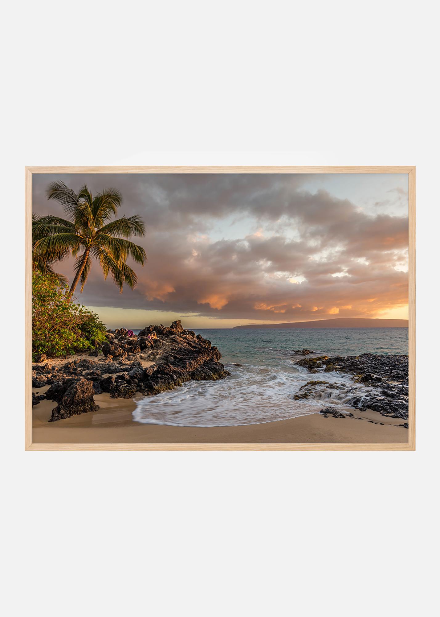 Pláž při západu slunce, krásné klišé, které je nutností pro tiki fanoušky nebo tropické téma. Plakát s klasickou palmou, která se naklání nad okrajem pláže v posledních zlatých paprscích dne. Fotografie vypadá krásně v rámečku s jedním opotřebovaným vzhledem nebo v silné barvě, aby ladila s tiki interiérem.
