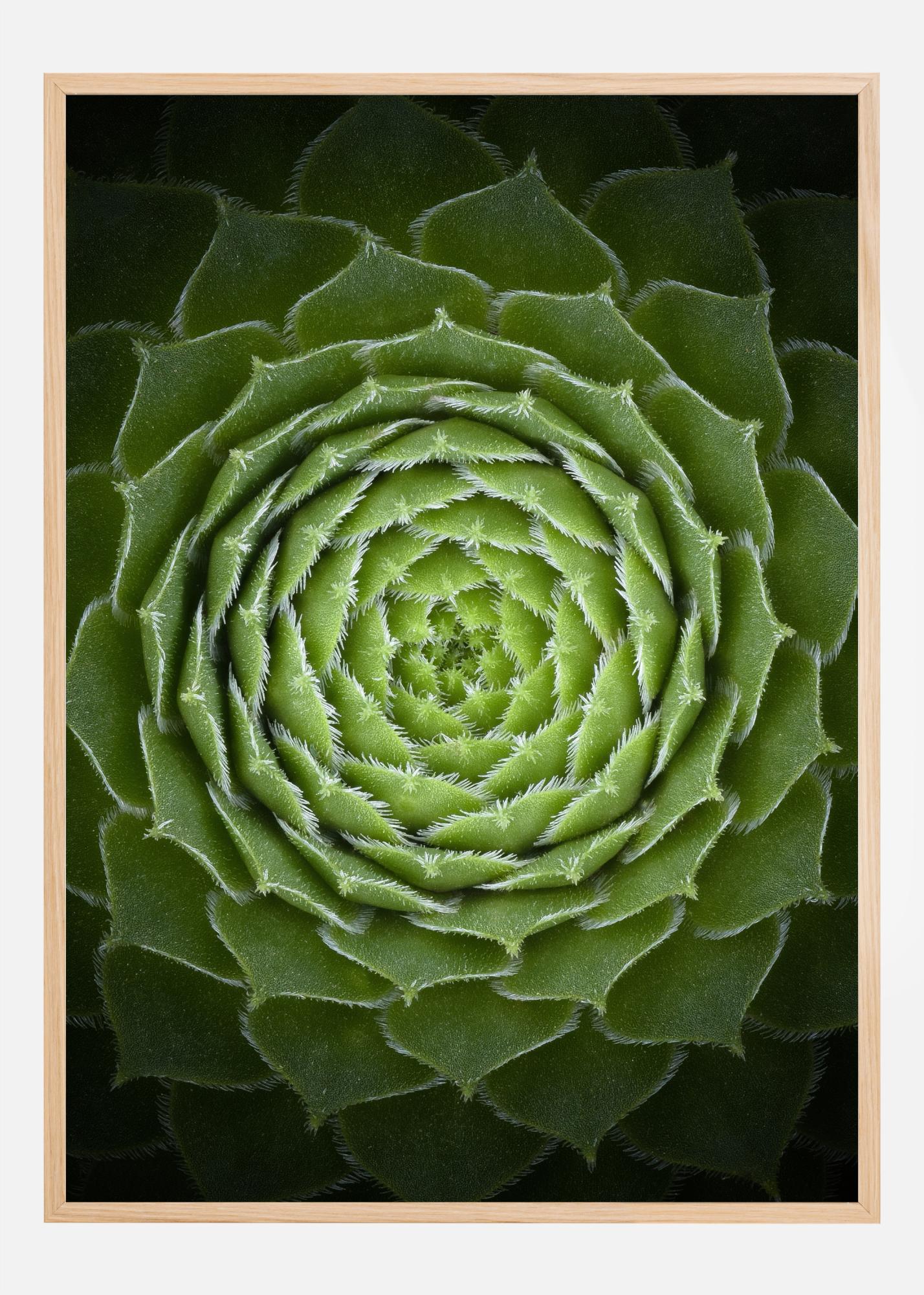 Detailní plakát se šťavnatou zeleninou. Světle zelené listy se točí do růžicového vzoru. Špičky každého listu v růžici jsou vykresleny ostrými detaily a malé bílé hroty jsou vidět, když se zadíváte do všech kruhů této živé zelené rostliny.