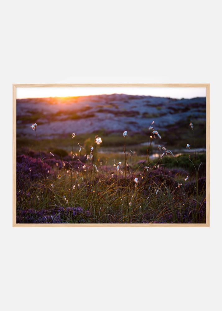 Krásný scenický plakát s divokými květinami, které osvětluje červené světlo zapadajícího slunce. Tráva a kameny se rozsvítí, když slunce zapadá za vrchol hory, a vytvářejí teplo tohoto letního večera. Představte si piknik v této krásné krajině.