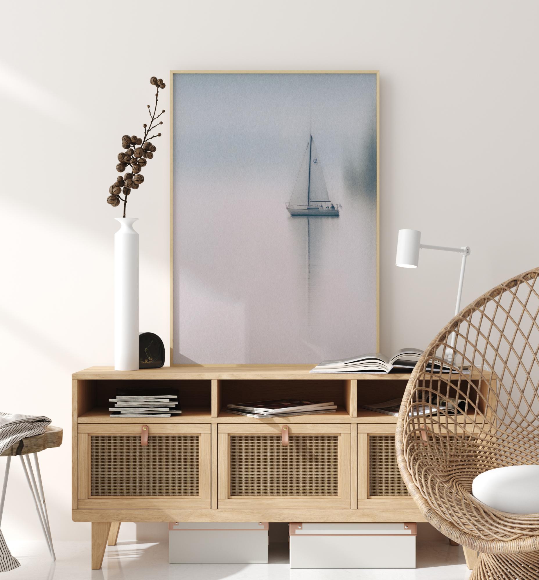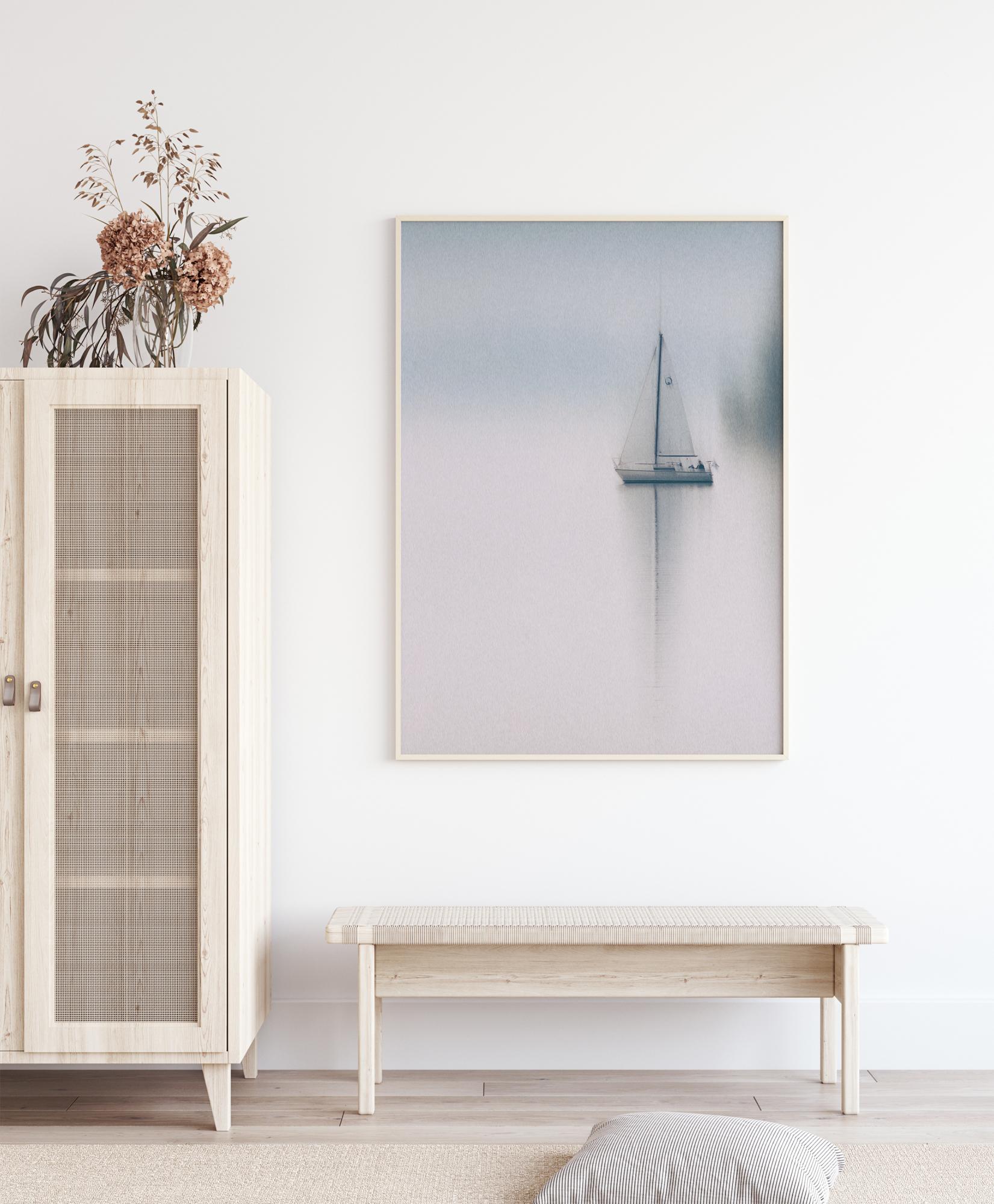 Uklidňující plakát jachty uprostřed bílého jezera. Obrázek je jemný s rozmazanými okraji všech postav. Plachta lodi se táhne po vodě, když klouže v světle modré a šedé mlze brzy nedělní ráno.