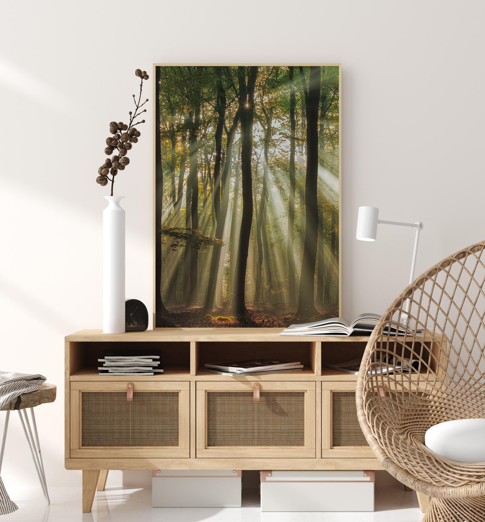 Lesní plakát se slunečními paprsky, které padají mezi vysoké kmeny stromů. Dlouhé kmeny přitahují pohled vzhůru obrazem. Jako hvězda září slunce nahoře skrz otvor a vrhá jemné paprsky přes stromy, které osvětlují les měkkým zeleným světlem. Představte si procházku v klidném lese.