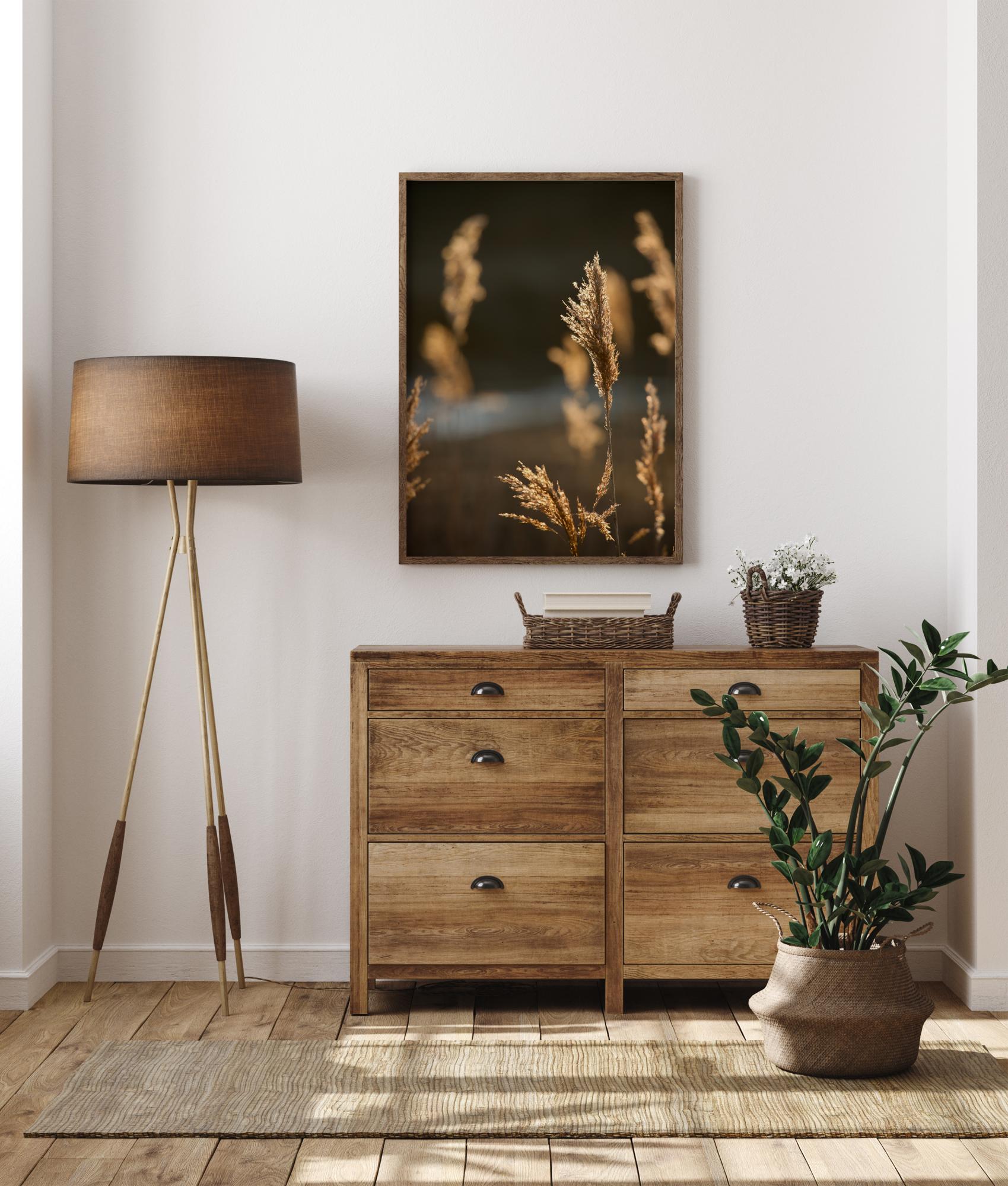 Letní plakát se slunečním svitem na poli. Detail stébel trávy, které se vlní v letním vánku. Zachycují zlaté světlo slunce, které se také třpytí na vzdálené řece. Užijte si tento obklopující a jemný obraz, který přináší léto do vašeho domova, když ho pověsíte.