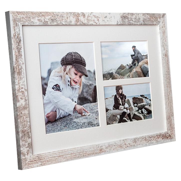 Stylový vintage rám s širokým profilovým rámem s ošuntělým vzhledem v bílé a dřevěné barvě. Dodává vašim obrázkům další rozměr a je ideální, když chcete mít autentický pocit z vintage. Rámeček pro koláže má místo pro 3 obrázky různé velikosti.