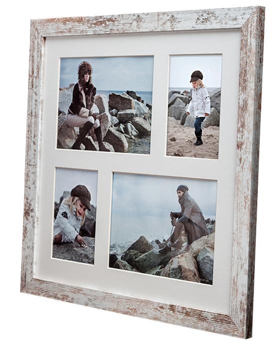 Stylový vintage rámeček se širokým profilem rámu s opotřebovaným vzhledem v bílé a dřevěné barvě. Dodává vašim obrázkům další rozměr a perfektně se hodí, když chcete mít autentický pocit z vintage. Kolážový rámeček má místo pro 4 obrázky v různých velikostech.