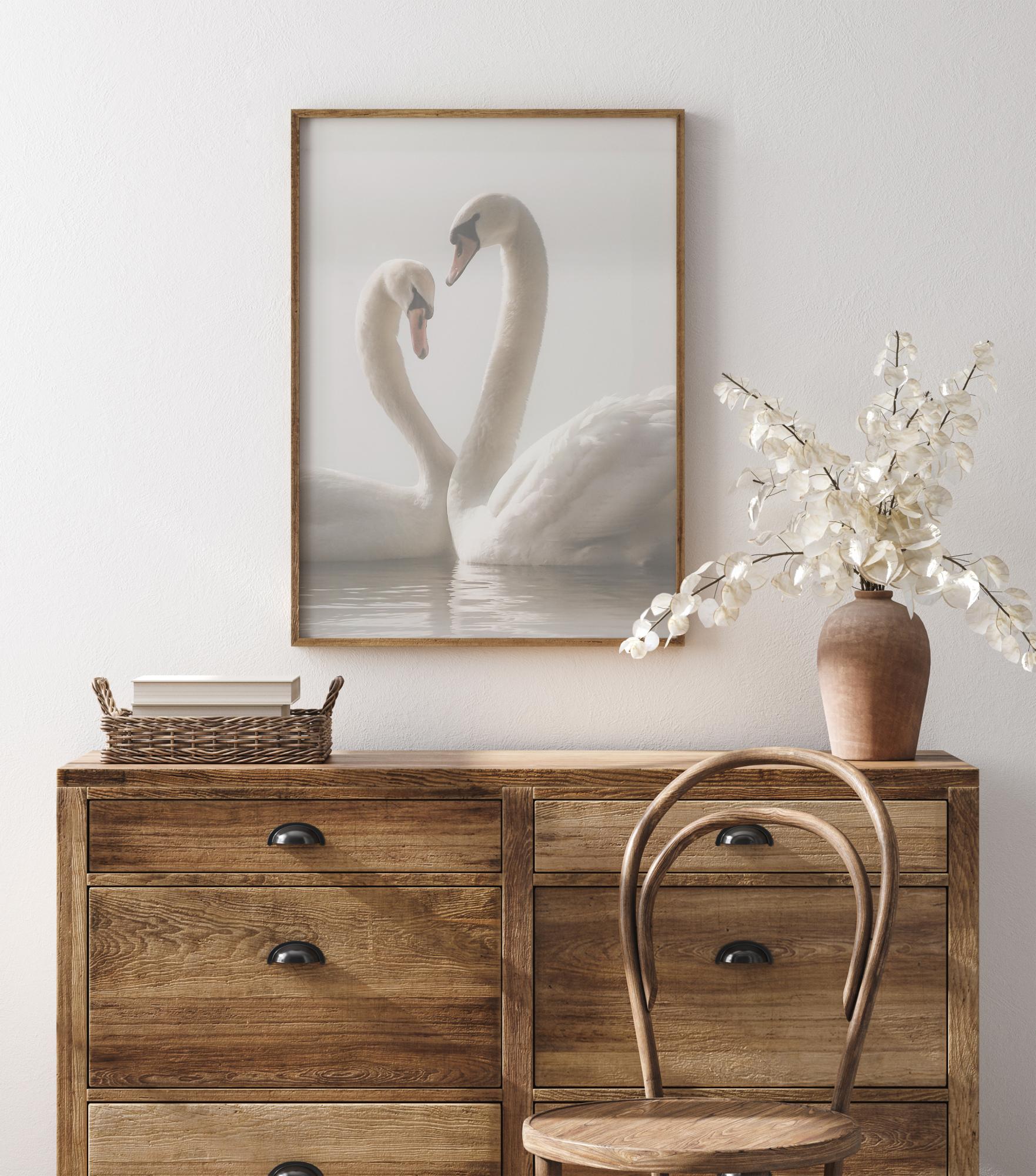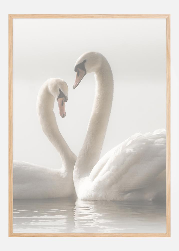 Romantický plakát s dvěma labutěmi, které plavou spolu. Měkké osvětlení dodává této fotografii harmonický klid, kde labutě kloužou k sobě. Jejich krky se zvedají a vytvářejí tvar srdce. Cítit lásku v této okouzlující fotografii.
