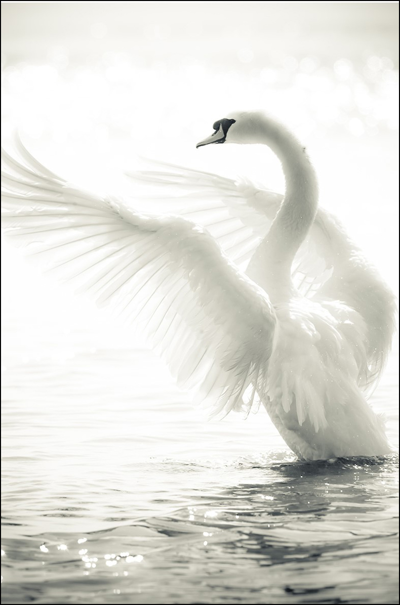 Krásná černobílá fotografie labutě, která natahuje křídla k obloze a užívá si slunečního svitu. Plakát má elegantní a klidnou atmosféru, která se hodí stejně dobře do dětského pokoje jako do zbytku domu. Motiv se také dobře hodí do veřejného prostoru, kde je příjemné spočinout očima na něčem atraktivním.