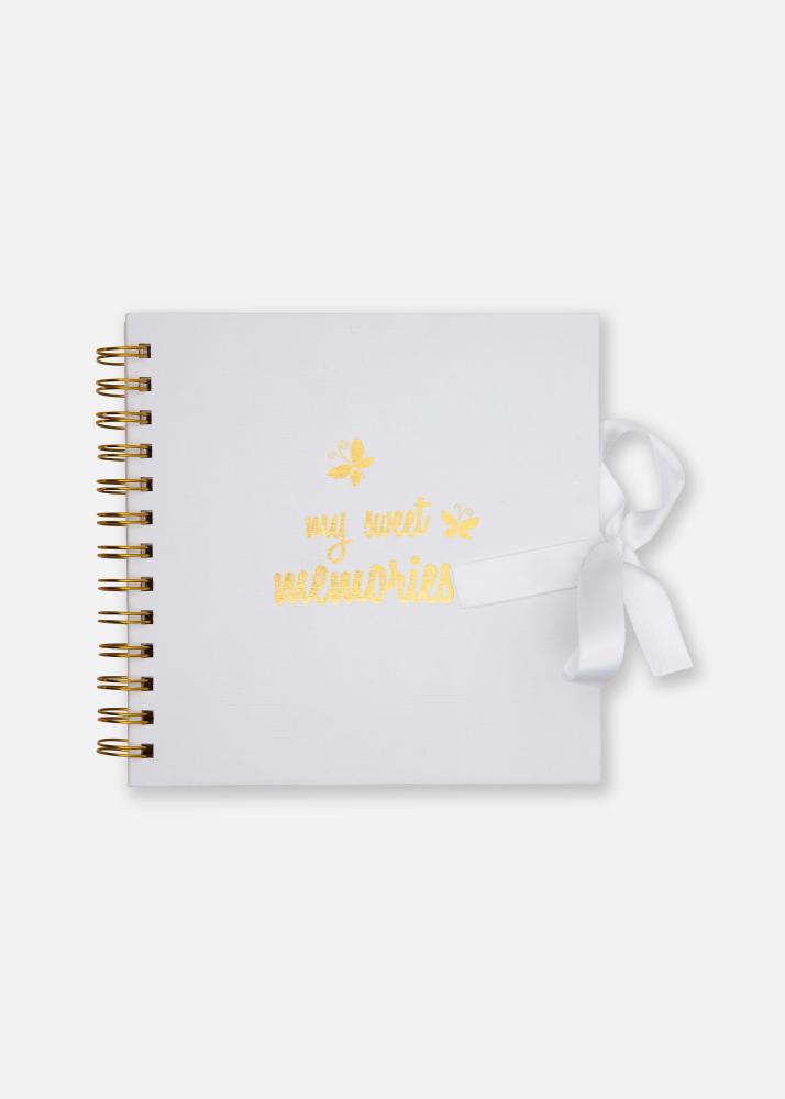 Roztomilé spirálové album, které můžete uzavřít pomocí bílých stuh. Perfektní album pro uchování všech vašich nejkrásnějších vzpomínek! Na přední straně je text "My sweet memories" vytištěn zlatem a obklopen motýly. Album obsahuje 24 bílých listů bez kyselin.