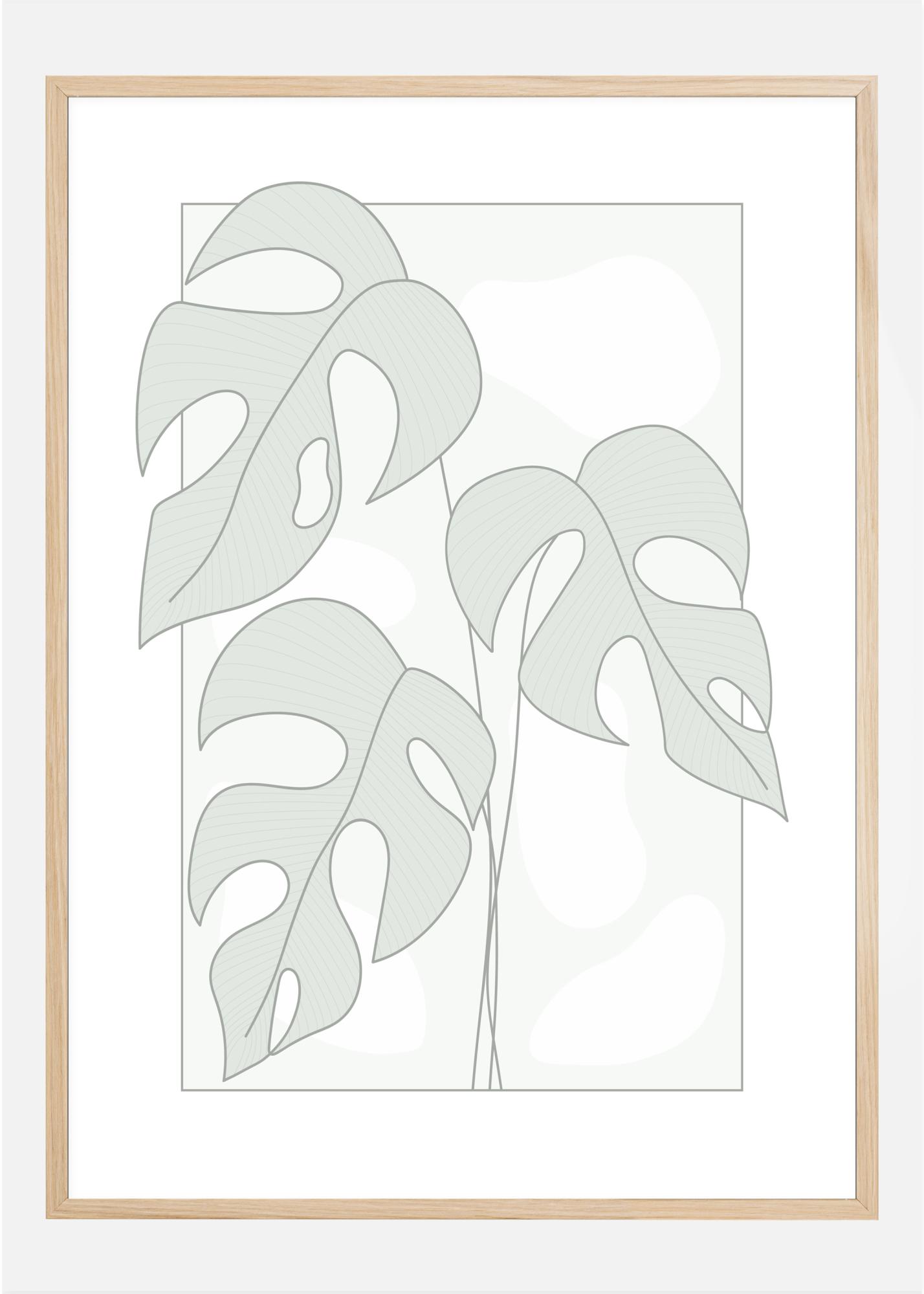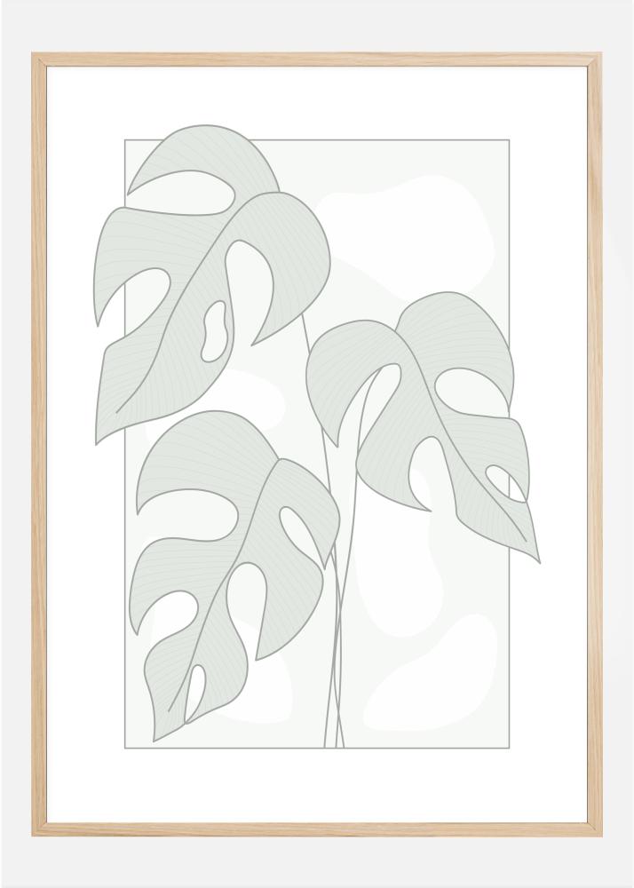 Jednoduchý plakát s ilustrovanými listy monstera. Tři velké listy zaplňují obrys, každý v jemném šedém tónu. Tenčí linie tvoří stonky, když tyto elegantní listy s otvory visí dolů na tomto obrázku. Udržujte to diskrétně pověšením tohoto plakátu na jemně zelenou stěnu pro pocit přírody.