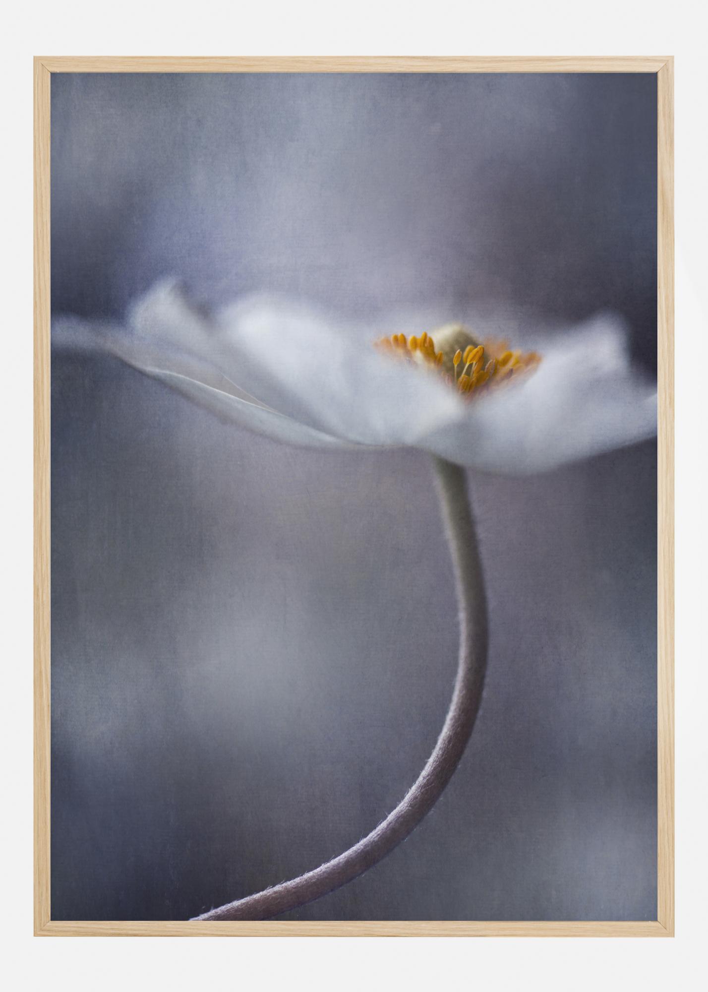 Plakát s květinami se záběrem na detail bílého květu na jemném šedém pozadí. Oranžové centrum květu vystupuje proti tlumenému pozadí, čímž vytváří jasný ohniskový bod a zdůrazňuje krásu květu, stejně jako i vnějšku. Je éterický a magický a vyzařuje klid.