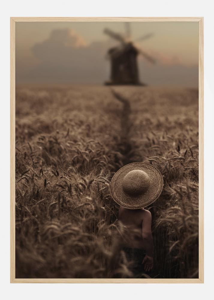 Portrétní plakát chlapce na pšeničném poli s větrným mlýnem v dálce. Jemné žluté a růžové barvy vytvářejí skutečně klidnou pózu. Odvažte se vydat k tomu větrnému mlýnu společně s chlapcem pomocí tohoto obrazu.
