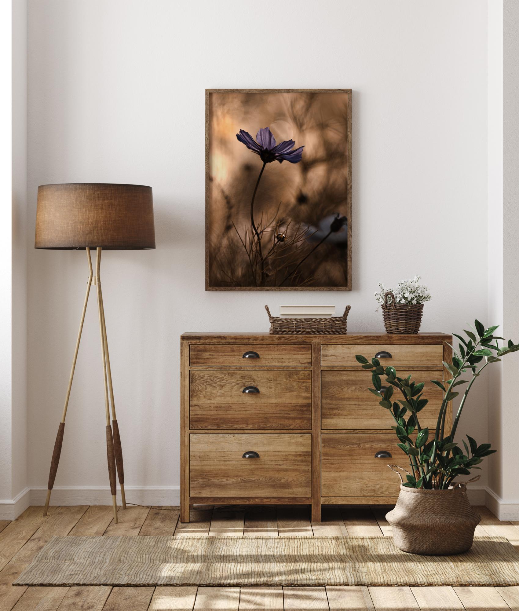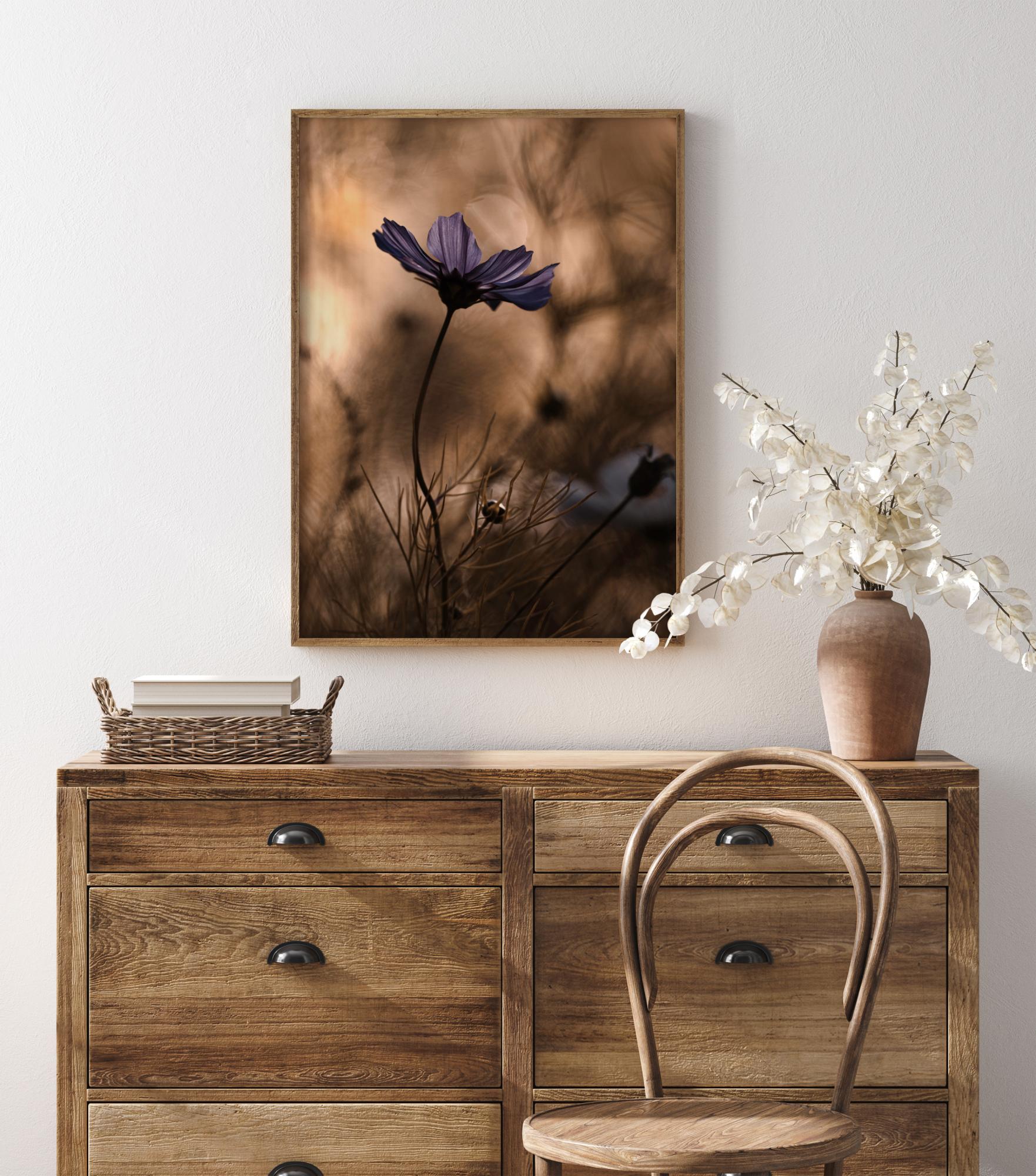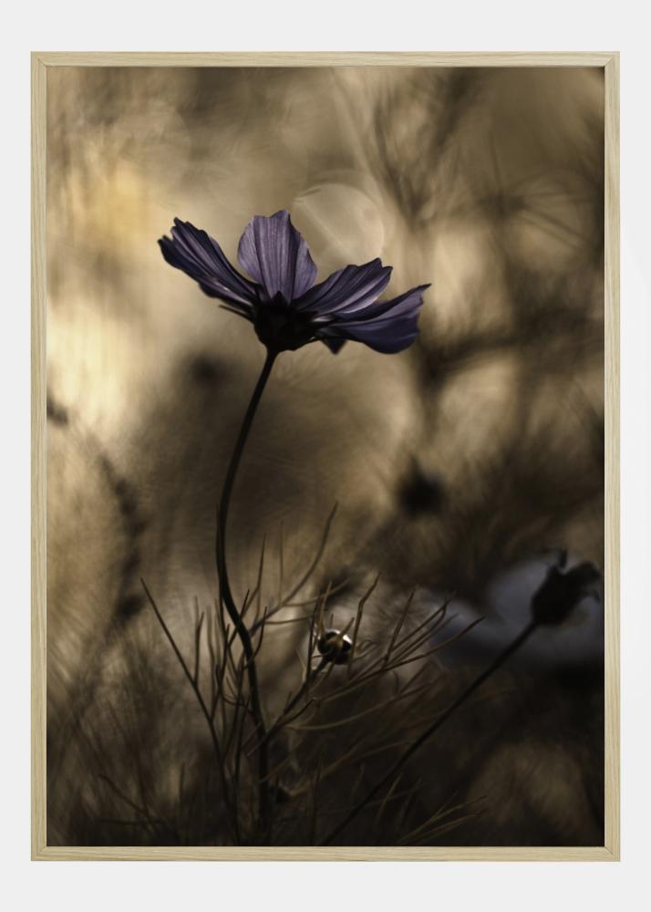 Plakát s květinami s květinou světle fialové barvy, která se vlní na měkkém hnědém pozadí. Fialové okvětní lístky jsou dramaticky zvýrazněny proti neostřeným rostlinám v pozadí. Další tvary lze vidět, když pohled klouže podél zakřivených stonků, aby zachytil celý obraz.