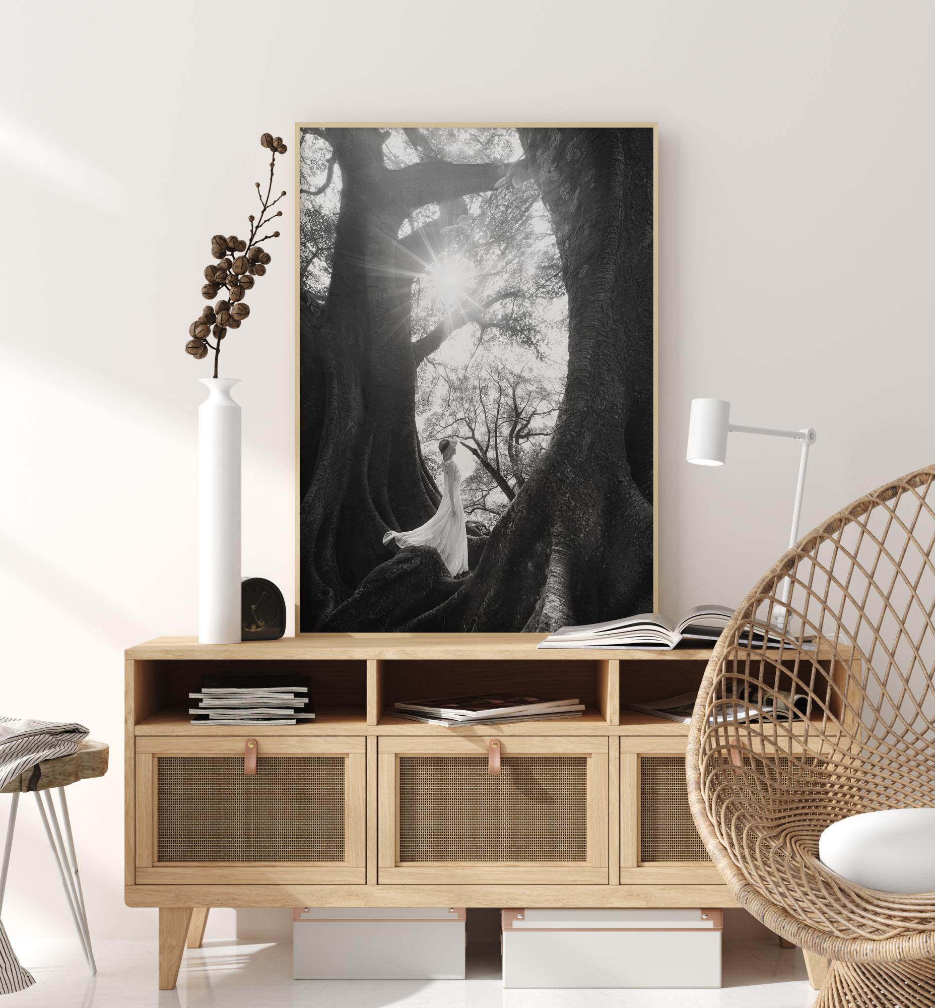 Úžasný přírodní plakát s obrovskými stromy, paprskem slunce a ženou stojící mezi nimi. Paprsek světla vás vtáhne do této mystické fotografie. Dodejte svému domovu pocit klidu a míru pomocí tohoto obrazu.
