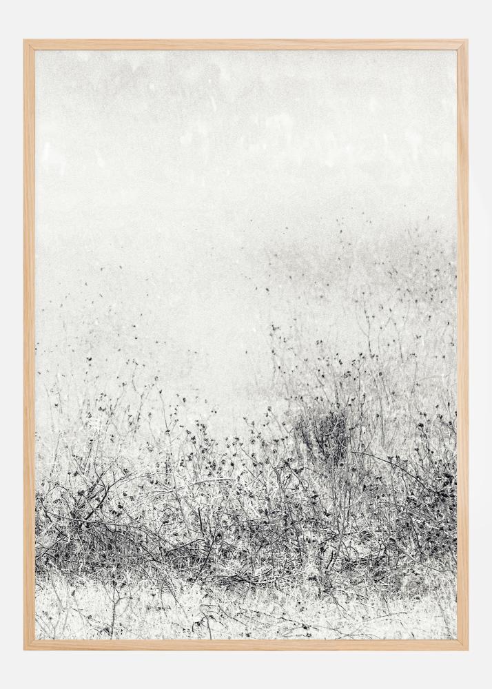 Umělecký plakát s nekonečnými travními poli v černobílé. Roztrhané tečky a čáry to dělají, že to vypadá jako zamotaná hustá houština trávy a ostružinových keřů. Připomíná to obraz Jacksona Pollocka s jeho zvláštním čmáráním. Čáry vystupují ostře a jasně na bílém pozadí.