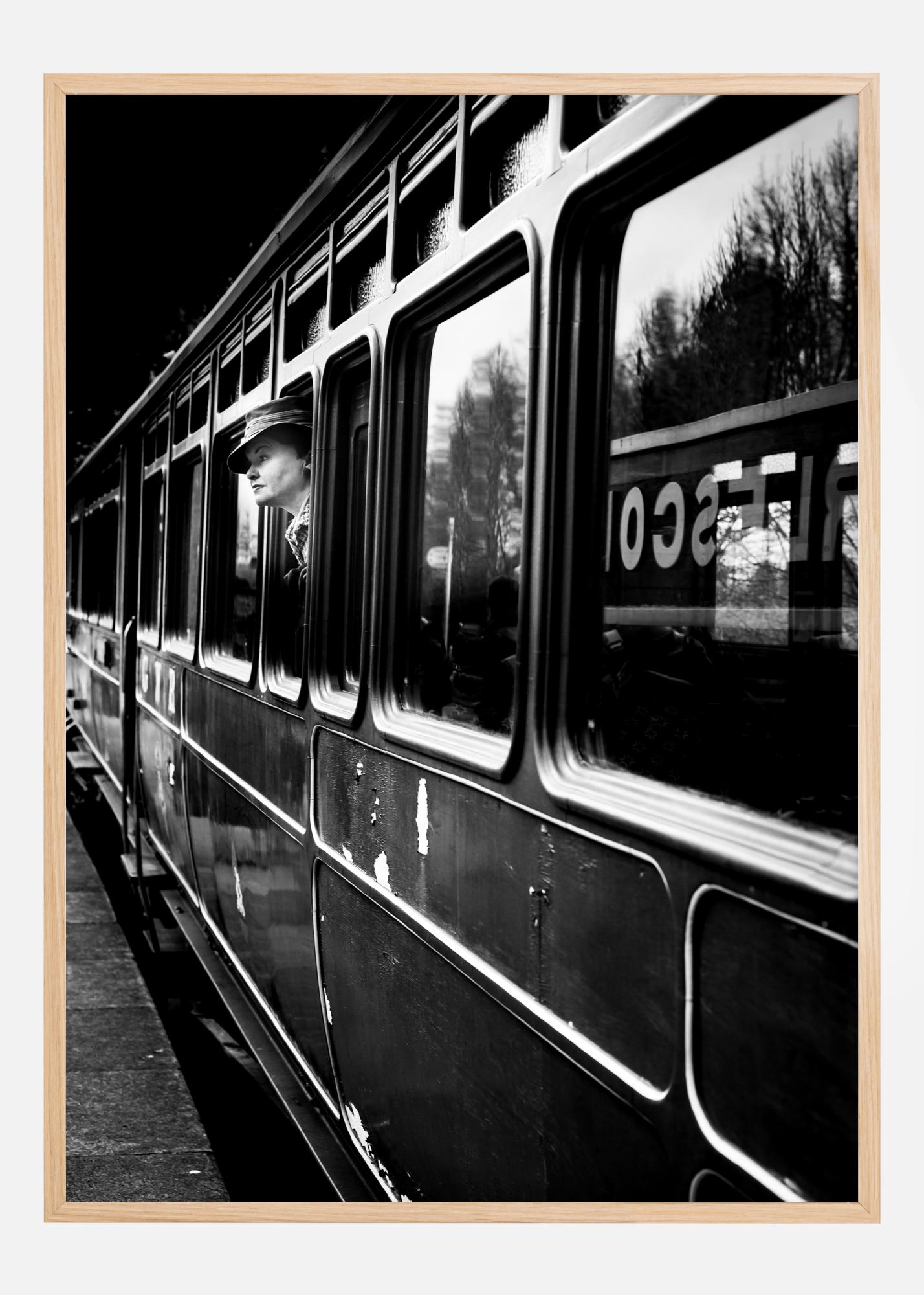 Tento sugestivní černobílý plakát zachycuje nostalgický moment osoby, která se dívá z okna vlaku. Osoba, oblečená v klasickém klobouku, dodává obrazu nadčasový pocit, zatímco odrazy a kontrasty vytvářejí dramatickou a emocionální atmosféru. Zrcadlový povrch vlaku a tmavé obrysy přispívají k pocitu pohybu a změny.