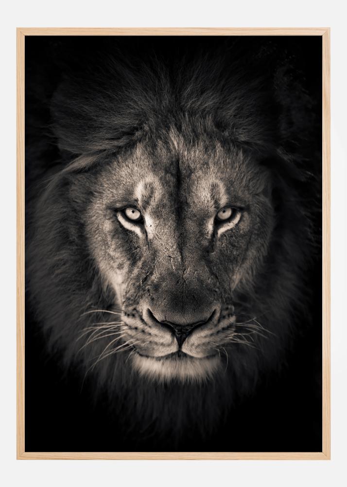 Tento silný a poutavý plakát zachycuje hluboký pohled lva, což vyvolává pocit jeho síly a přítomnosti. Černobílé tónování dává obrazu nadčasovou kvalitu a zdůrazňuje lvovy majestátní rysy a intenzitu, která je přítomna v jeho očích. Je to tisk, který vyzařuje autoritu a divokost, ideální reprezentace 'krále džungle'.