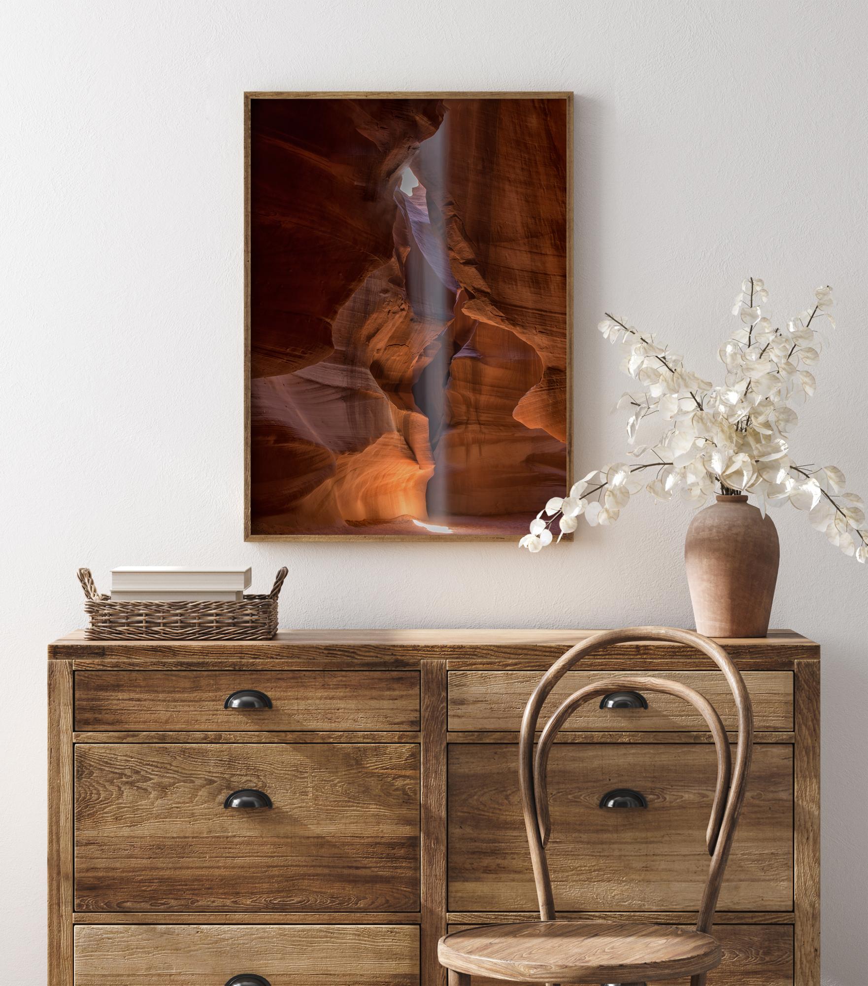 Kouzelný plakát s paprskem světla, který prochází dolů červenými útesy. Měkké křivky červených útesů vytvářejí teplou záři. Jediný paprsek světla dodává tomuto uzavřenému prostoru magickou atmosféru a dále osvětluje měkké útesy. Vezměte si toto dílo domů jako dramatický doplněk do vašeho domova.