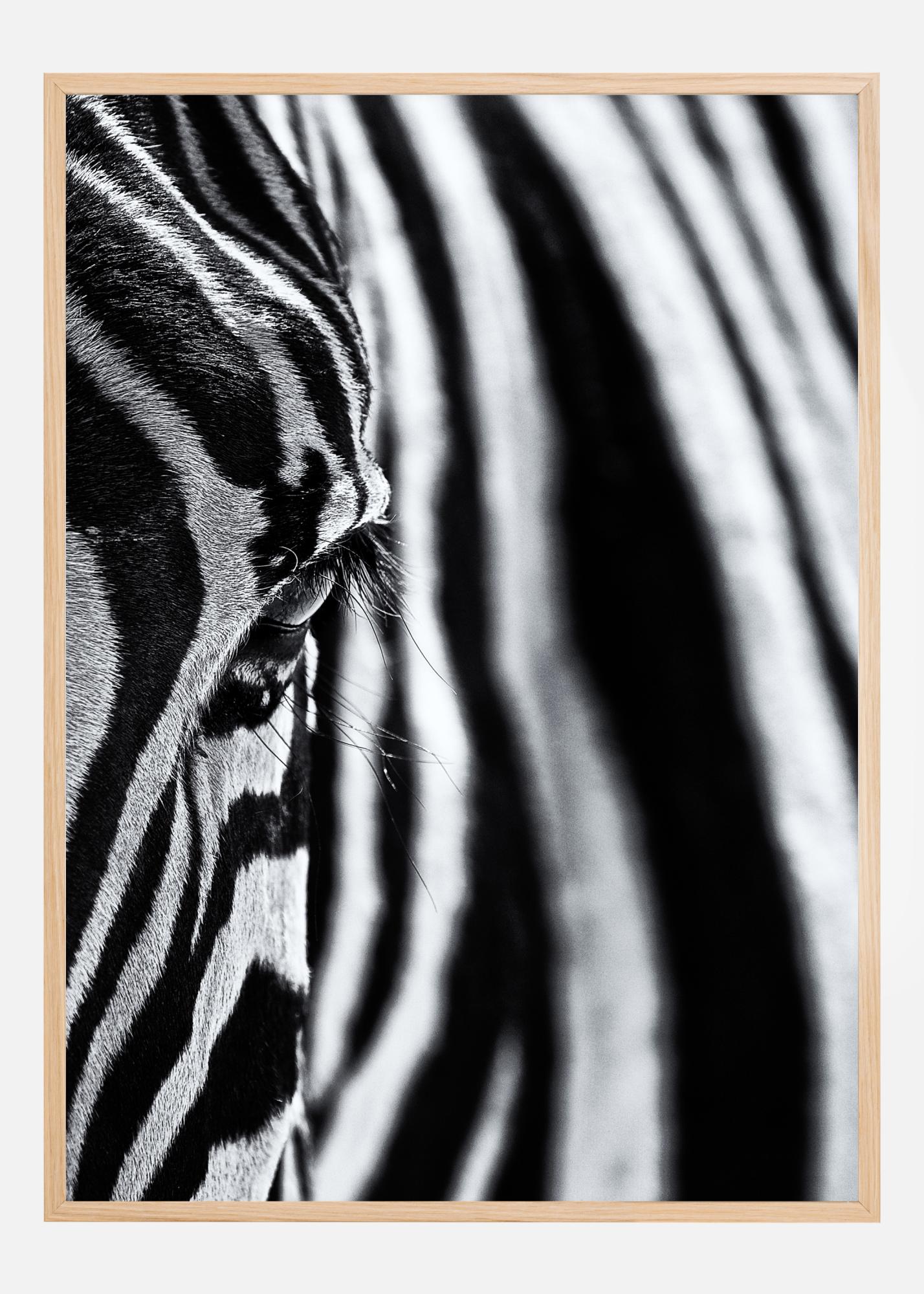 Detailní pohled na stranu obličeje zebry. Tlusté černé a bílé pruhy vytvářejí úžasné geometrické tvary, které přitahují pohled. Oko zebry a její řasy činí obrázek trochu jemnějším. Zavěste tento obraz na bílou zeď, abyste zachovali silný černobílý efekt.