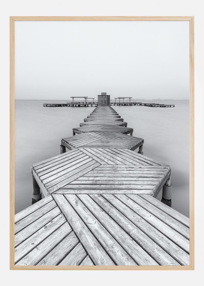 Zábavný plakát s šestiúhelníkovým molem, který se vine směrem k dálkám po klidném jezeře. Obrázek je v tlumených šedých tónech, které působí spíše chladně než teple. Dřevěné molo vás vede do dáli, kde na vás čeká přístavní můstek. Kombinujte s jasnou barvou pro dodání tepla.