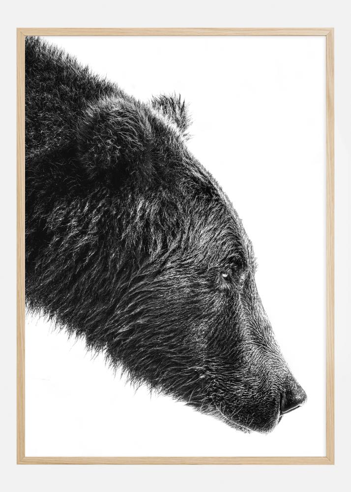 Tento elegantní a mocný tisk představuje detailní záběr na medvěda v černobílé barvě, motiv, který přináší syrový a upřímný pocit nespoutaného ducha přírody. Obrázek se zaměřuje na profil medvěda, kde každý detail srsti a klidné oči vynikají díky kontrastu mezi tmavými a světlými tóny.
