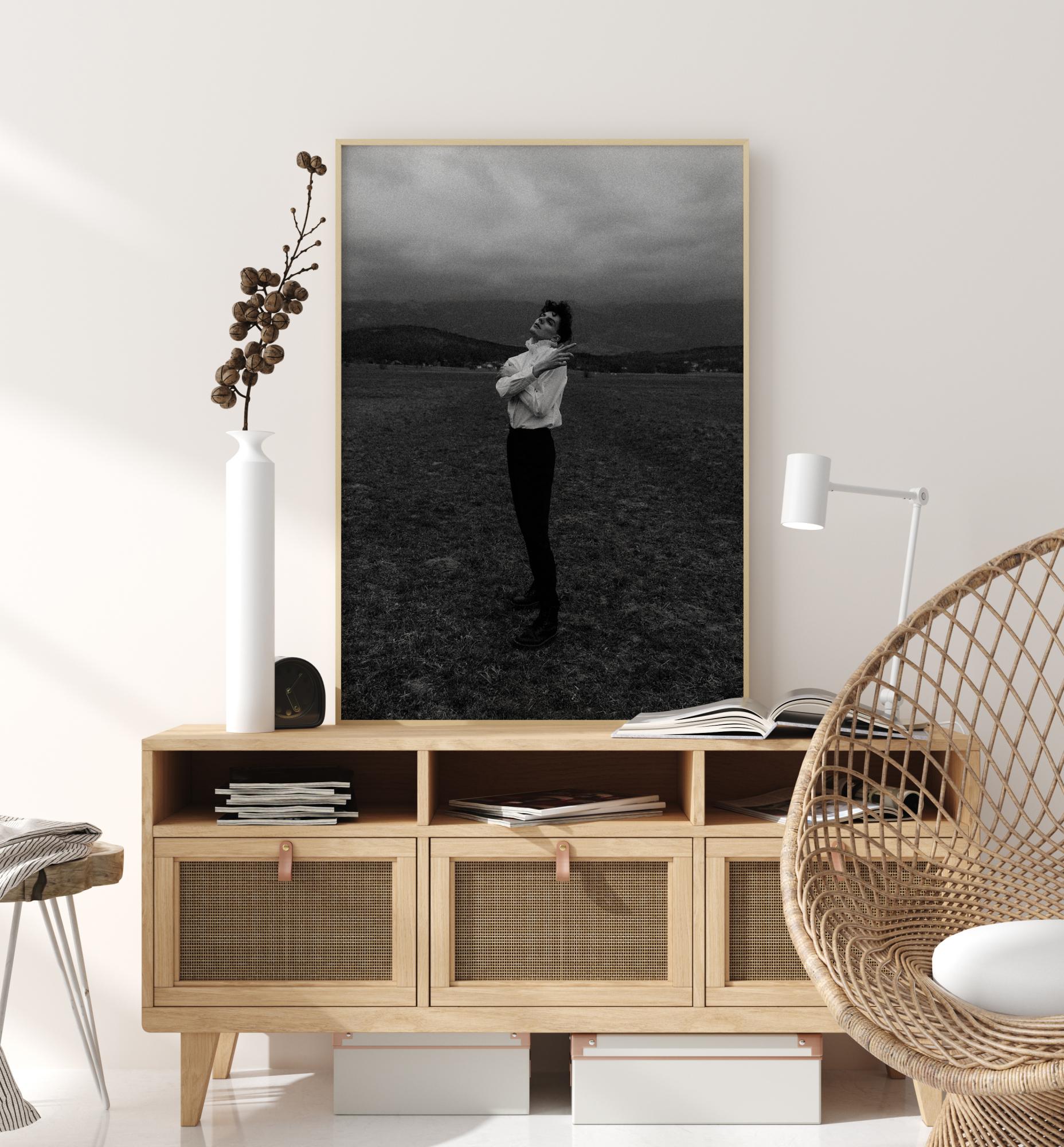 Portrétový plakát bezstarostného muže uprostřed otevřeného pole. Jemné černé a bílé tóny dodávají přirozený pocit. Užívejte si tento soukromý okamžik navždy zachycený, když si ho zavěsíte doma.