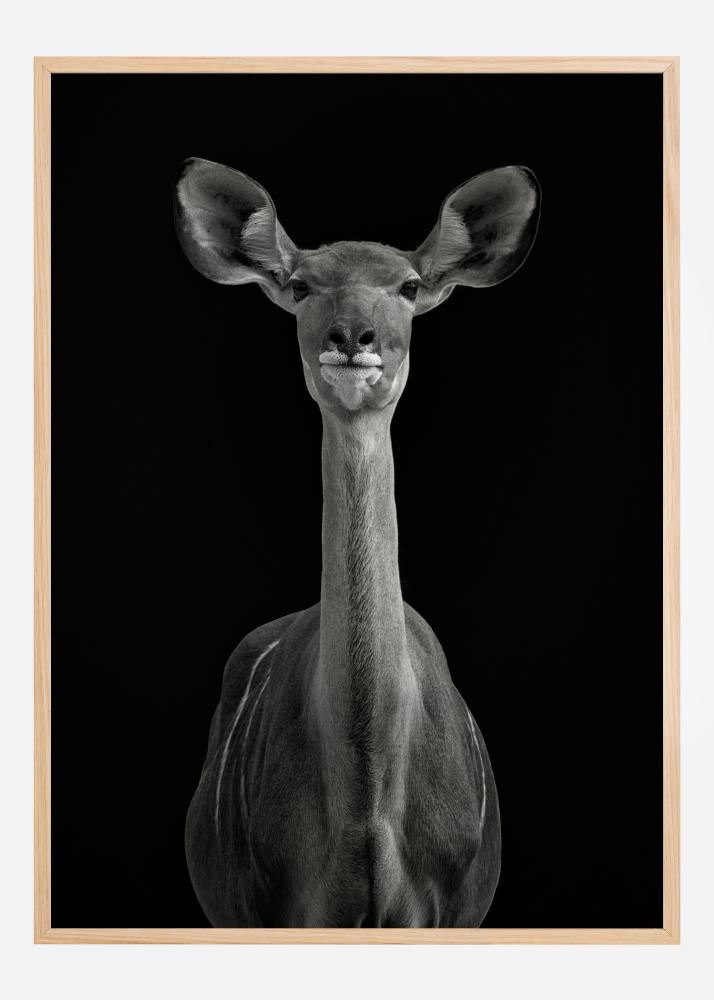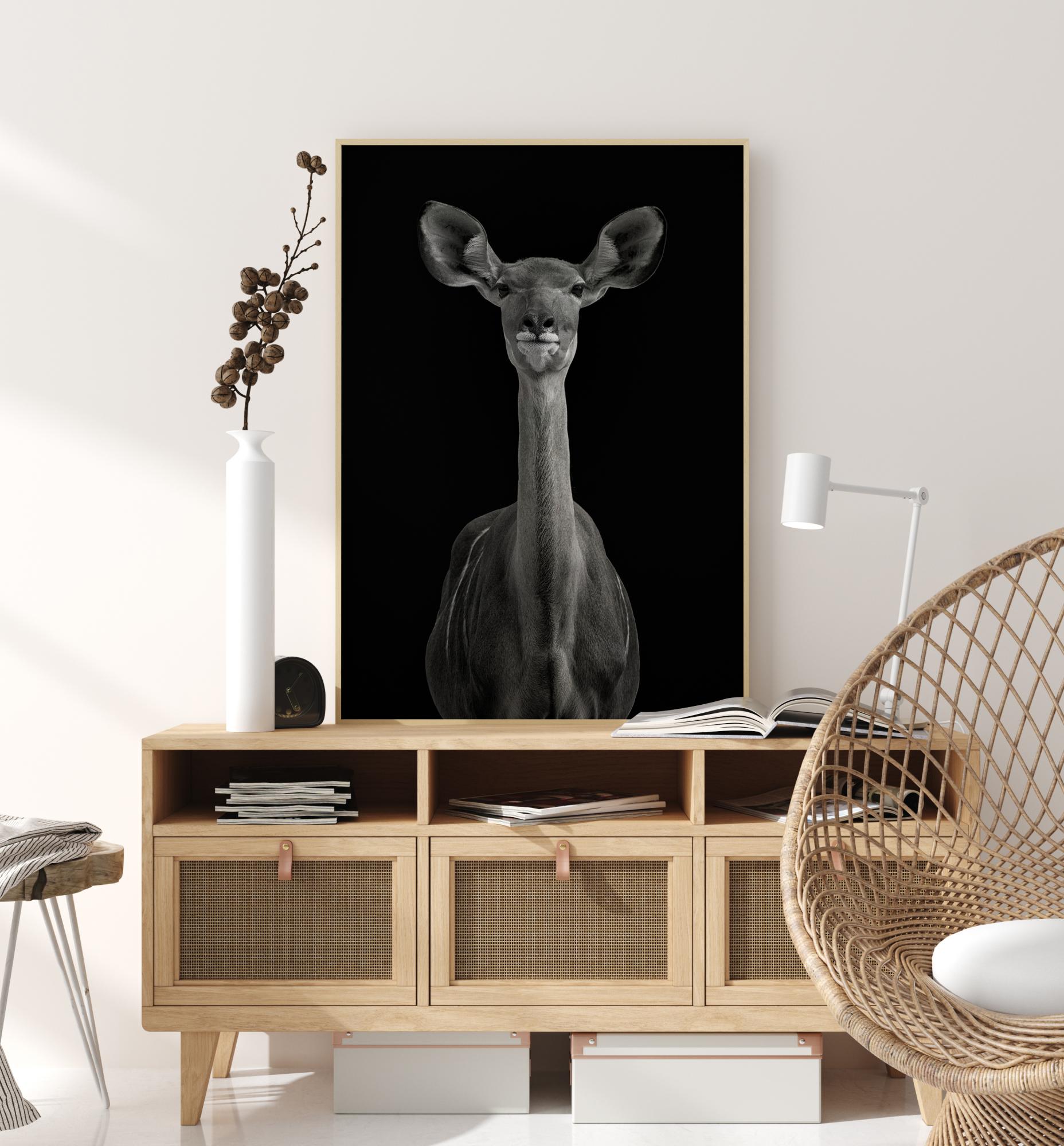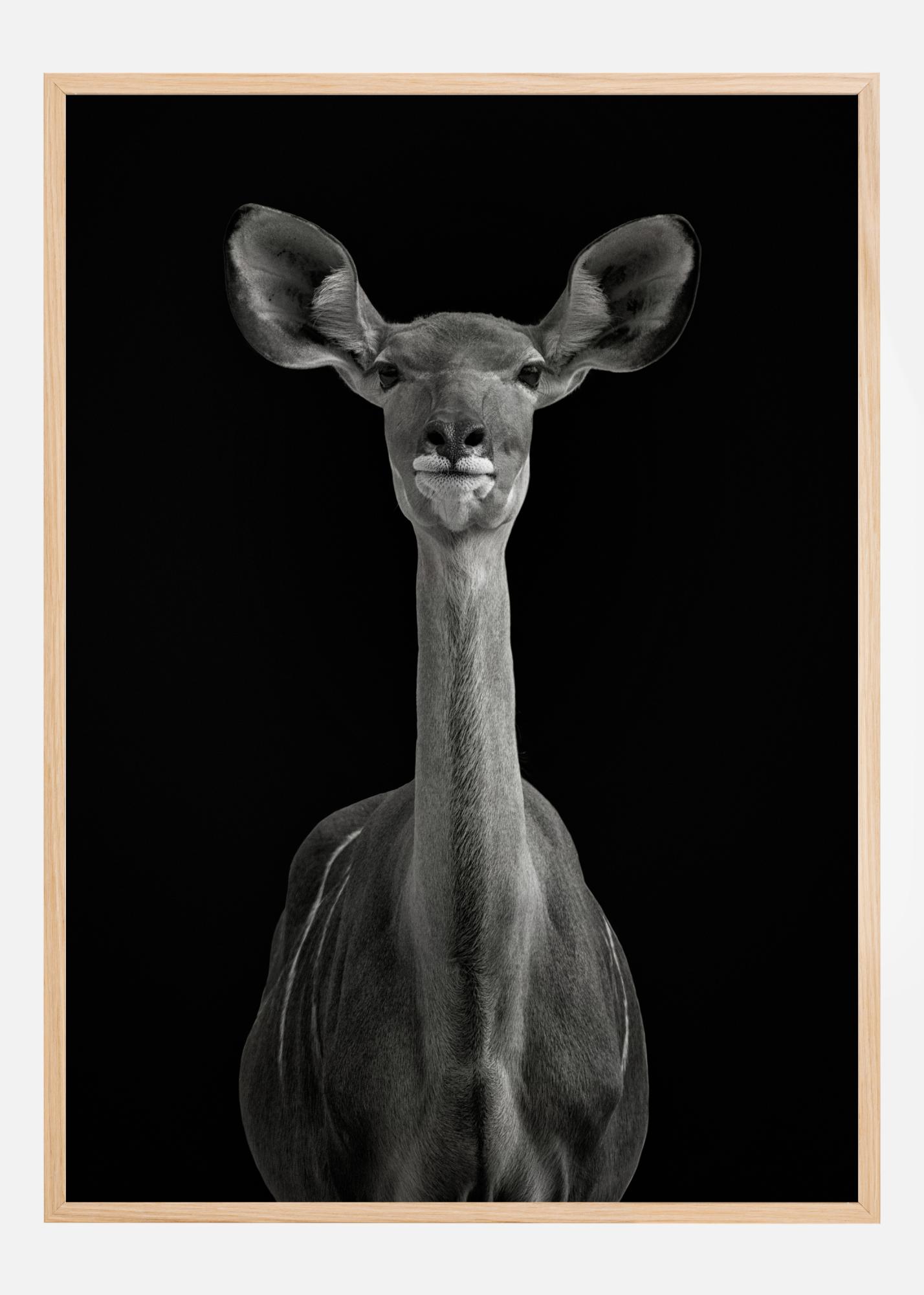 Úžasný portrét antilopy na hluboce černém pozadí. Antilopa se obrací ke kameře, s ušima vztyčenými dopředu, když se dívá a poslouchá. Její krk je dlouhý a štíhlý a její oči jemné. Kombinujte s jiným zvířecím tiskem pro vytvoření úžasného zoologického pocitu.