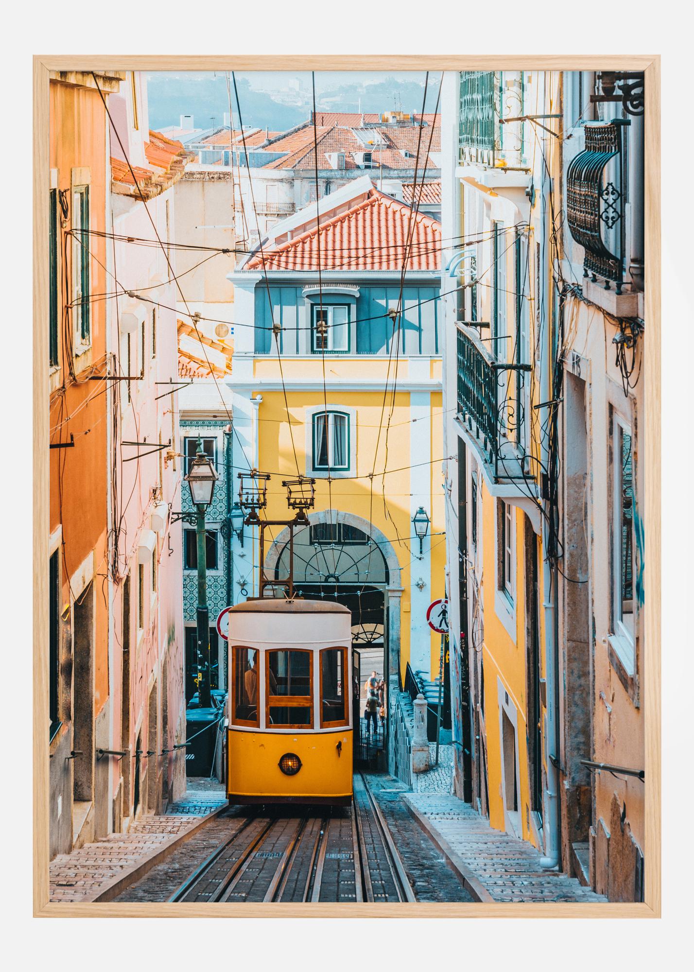 Tato barevná a malebná plaketa znázorňuje okouzlující a živou atmosféru na evropské městské ulici, plnou historie a každodenní magie. V popředí vidíme klasickou žlutou tramvaj, ikonický symbol městské hromadné dopravy, který se klidně pohybuje úzkými ulicemi lemovanými tradiční architekturou v teplých odstínech žluté a červené. Tento plakát je jako brána do jiného světa, který nás zve, abychom nastoupili a objevovali tajemství města.