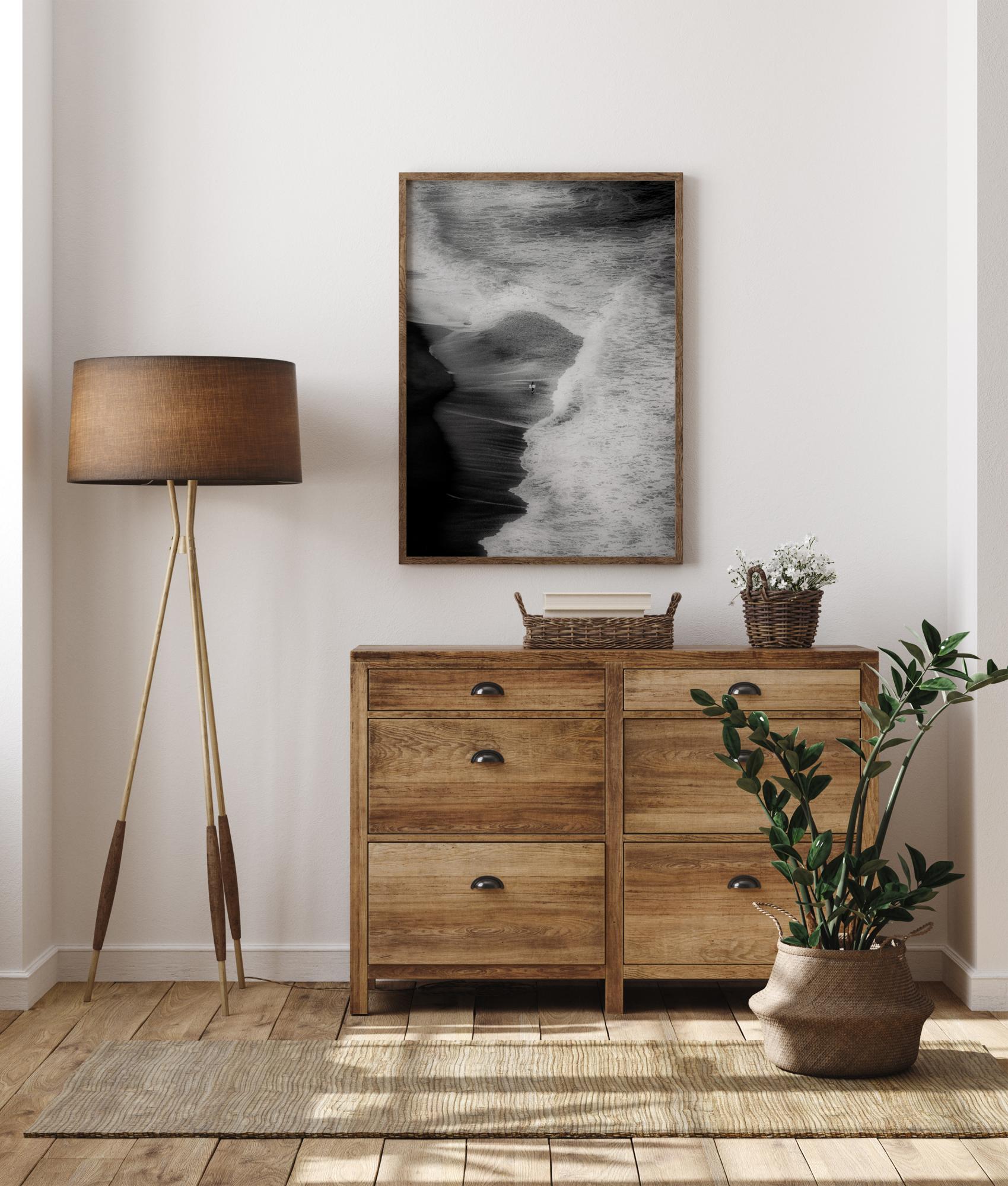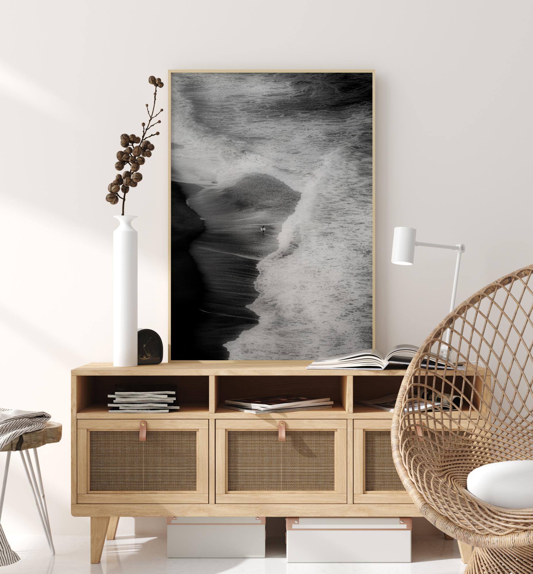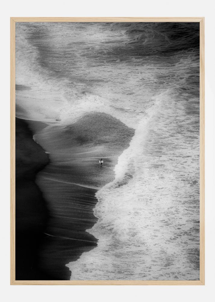 Plakát s pláží a surfováním z ptačí perspektivy. Tento abstraktní obraz ukazuje velkolepost přírody, když vlny dosahují k pobřeží - osamělý surfař tvoří ústřední bod obrazu.