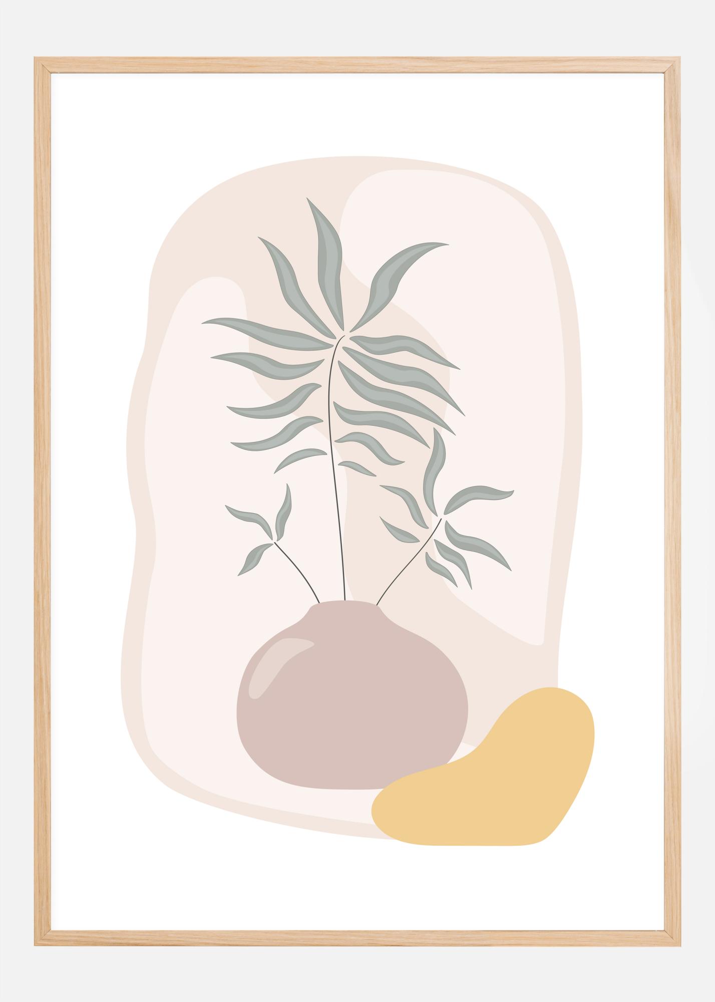 Stilizovaný plakát s vázou se zelenou rostlinou, která z ní vyčnívá. Další podivné tvary a barvy vyplňují pozadí a činí z tohoto díla zajímavé, ale poněkud abstraktní dílo. Sladěte s kresbou v podobném stylu, abyste si doma vytvořili vlastní mini galerii.