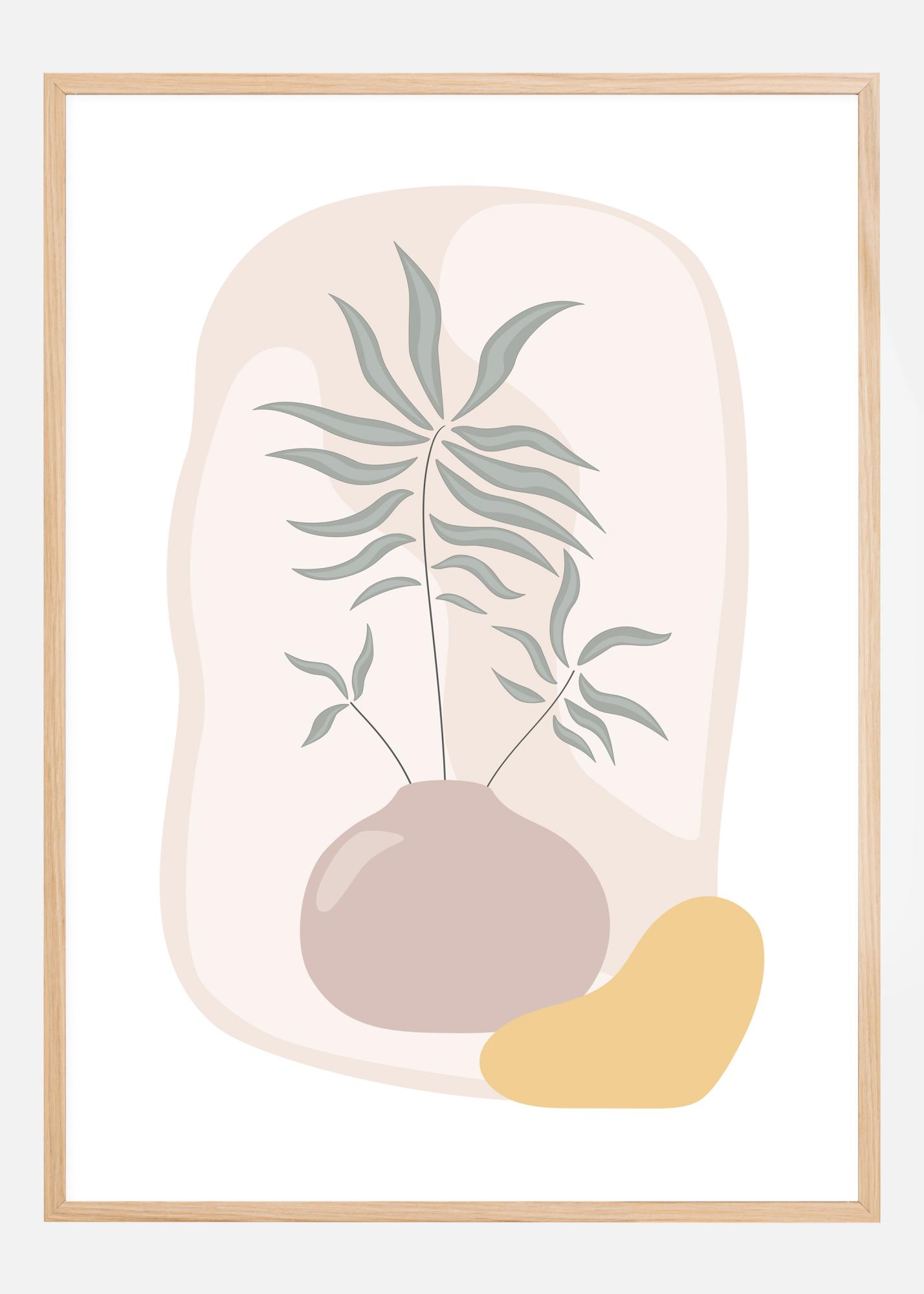 Stylizovaný plakát s vázou, ze které vyčnívá zelená rostlina. Další zvláštní tvary a barvy vyplňují pozadí a činí z toho zajímavé, ale poněkud abstraktní dílo. Spárujte s kresbou v podobném stylu a vytvořte si vlastní mini galerii doma.