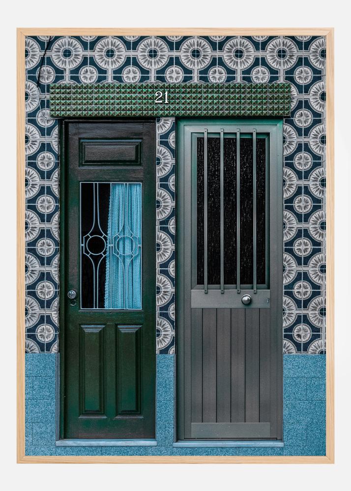 Interiérový plakát se dvěma dveřmi vedle sebe na světle modré kachlové zdi. Každé dveře mají jiný design, jedny jsou zelené a druhé šedé. Obě jsou umístěny pod cedulí s číslem 21, takže vedou ke stejnému domu nebo jsou to různá místa? Přineste si tento obraz domů a nechte fantazii udělat zbytek.