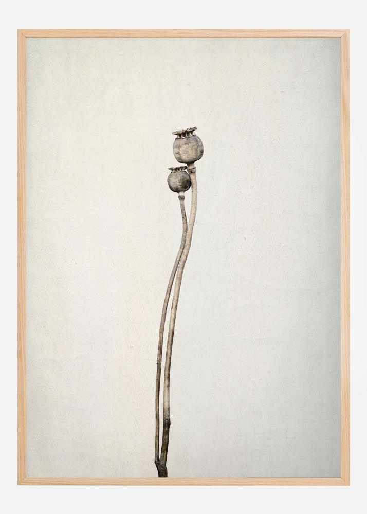 Květinový plakát se dvěma makovými makovicemi propletenými v tanci. Černobílý obraz má tato dvě dlouhá maková semena, která se kroutí proti bílému pozadí. Tento elegantní tanec upoutá pozornost, když se tyto makovice připravují prasknout a rozšířit svá semena pro pěstování nových květin.