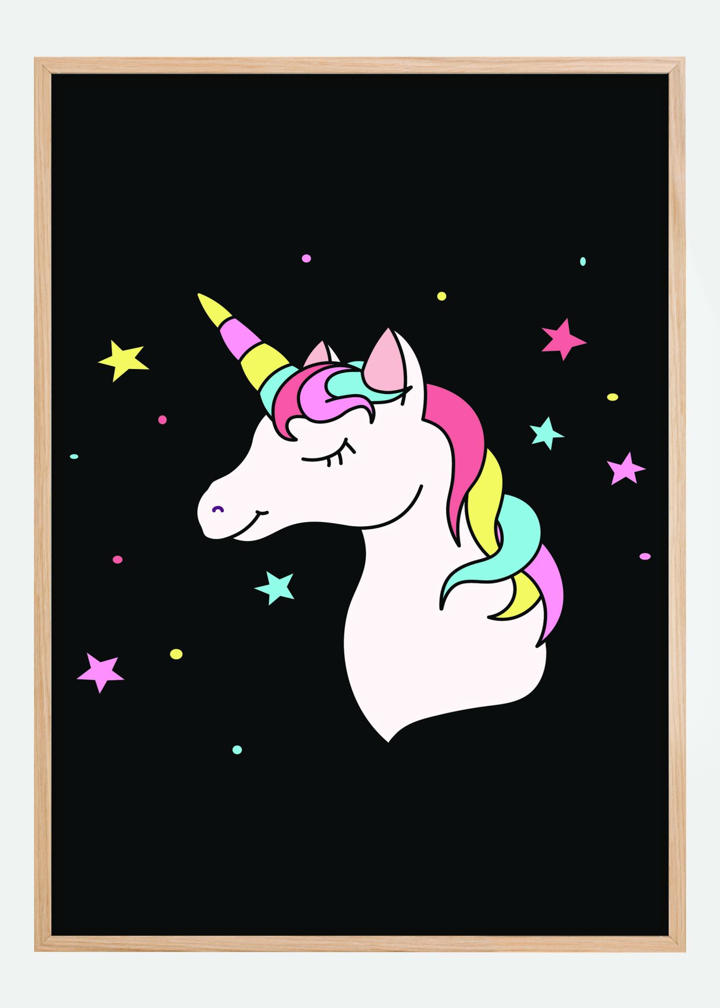 Roztomilý plakát s dětsky bílým jednorožcem na černém pozadí. Jednorožec má růžovou, žlutou a tyrkysovou hřívu a roh. Hvězdy ve stejných barvách vyplňují černé pozadí za ním, aby vytvořily zábavnou atmosféru hodnou princezny. Zavěste jej v dětském pokoji pro zábavný, zvláštní obrázek, který podporuje dětskou fantazii.
