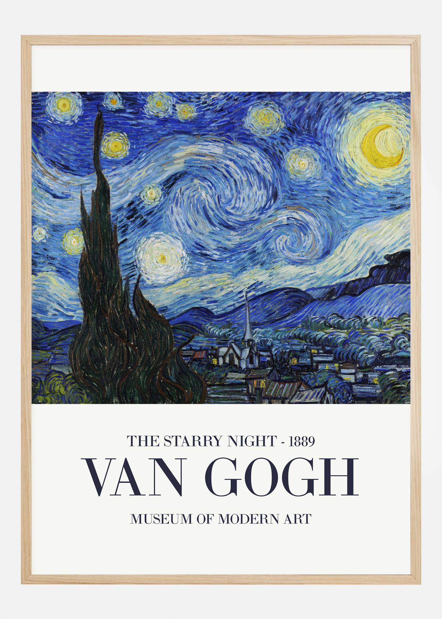 Toto je plakát, který zobrazuje nadčasové mistrovské dílo Vincenta van Gogha "Hvězdná noc", vytvořené v roce 1889. Dílo je proslulé svou dynamickou a emocionální reprezentací hvězdné noci nad malou vesnicí Saint-Rémy. Se svou vířící oblohou modré a žluté barvy a charakteristickým cypřišem, který se tyčí k noční obloze, van Gogh zachycuje pocit pohybu, který je i po více než století stále působivý.