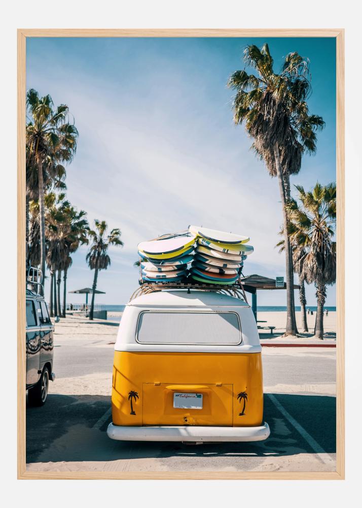 Vtipný prázdninový plakát se žlutým obytným vozem zaparkovaným na parkovišti poblíž pláže. Parkoviště je obklopeno palmami, což dodává dovolenkovou atmosféru. Jasné sluneční paprsky svítí na scénu a vytváří pocit příjemného teplého letního dne, ideálního pro rychlé surfování v moři na jednom ze surfovacích prken auta.