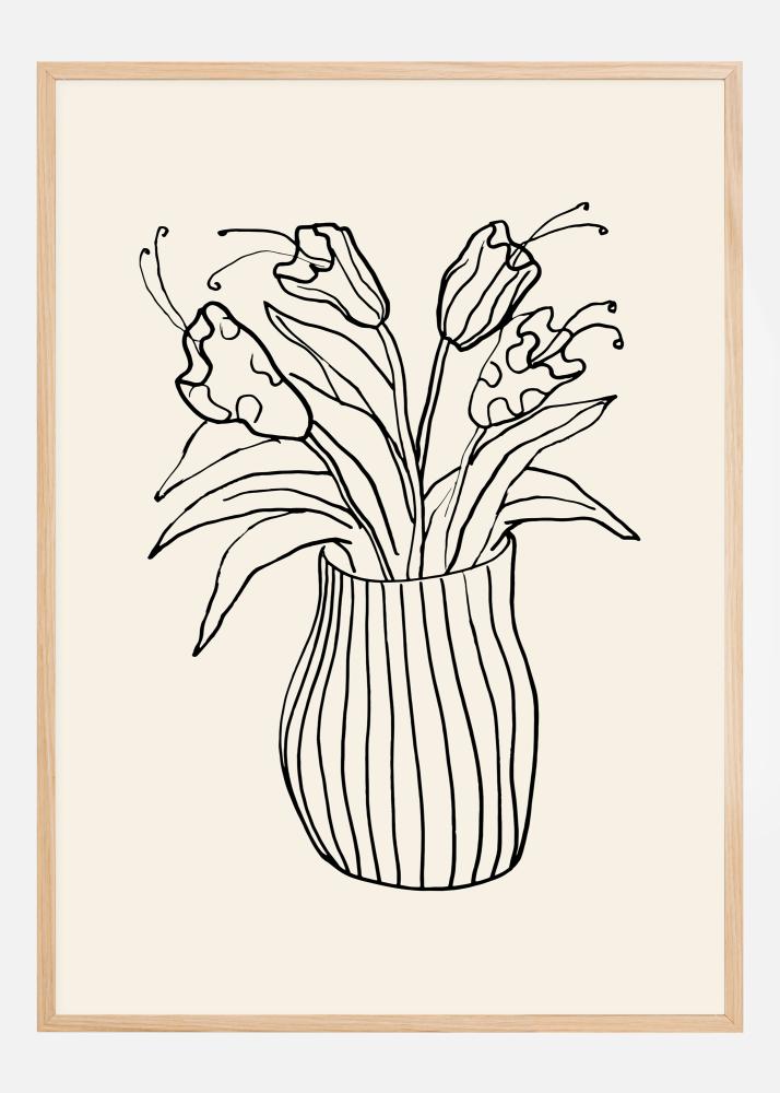 Stylizovaný plakát s květinami ve váze. Silné, odvážné černé linie hrubě vykreslují květiny ve váze. Květiny se výrazně objevují na bílém pozadí. Dodejte obrazu trochu extra barvy tím, že ho zavěsíte na světlou, odvážnou zeď.