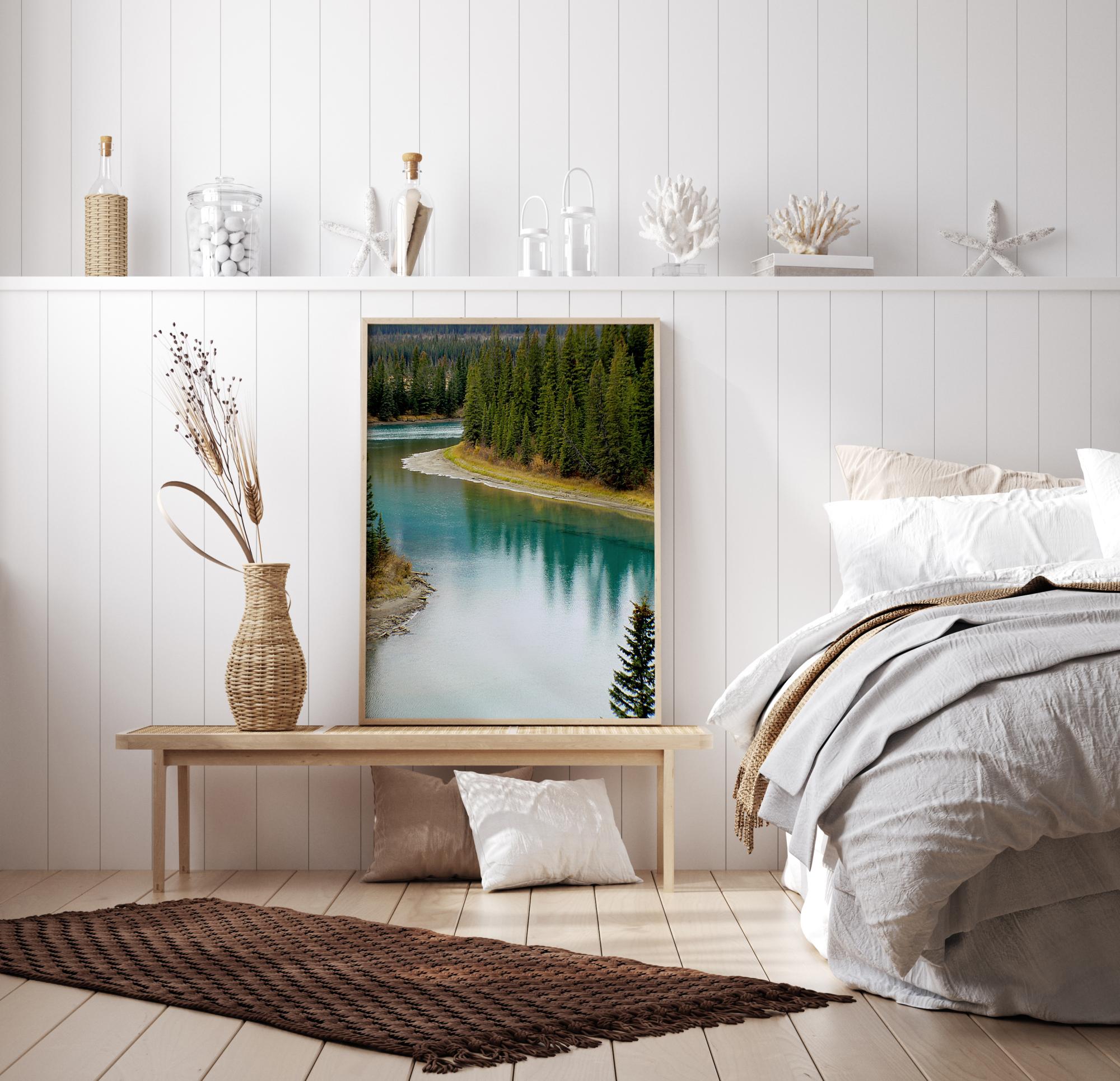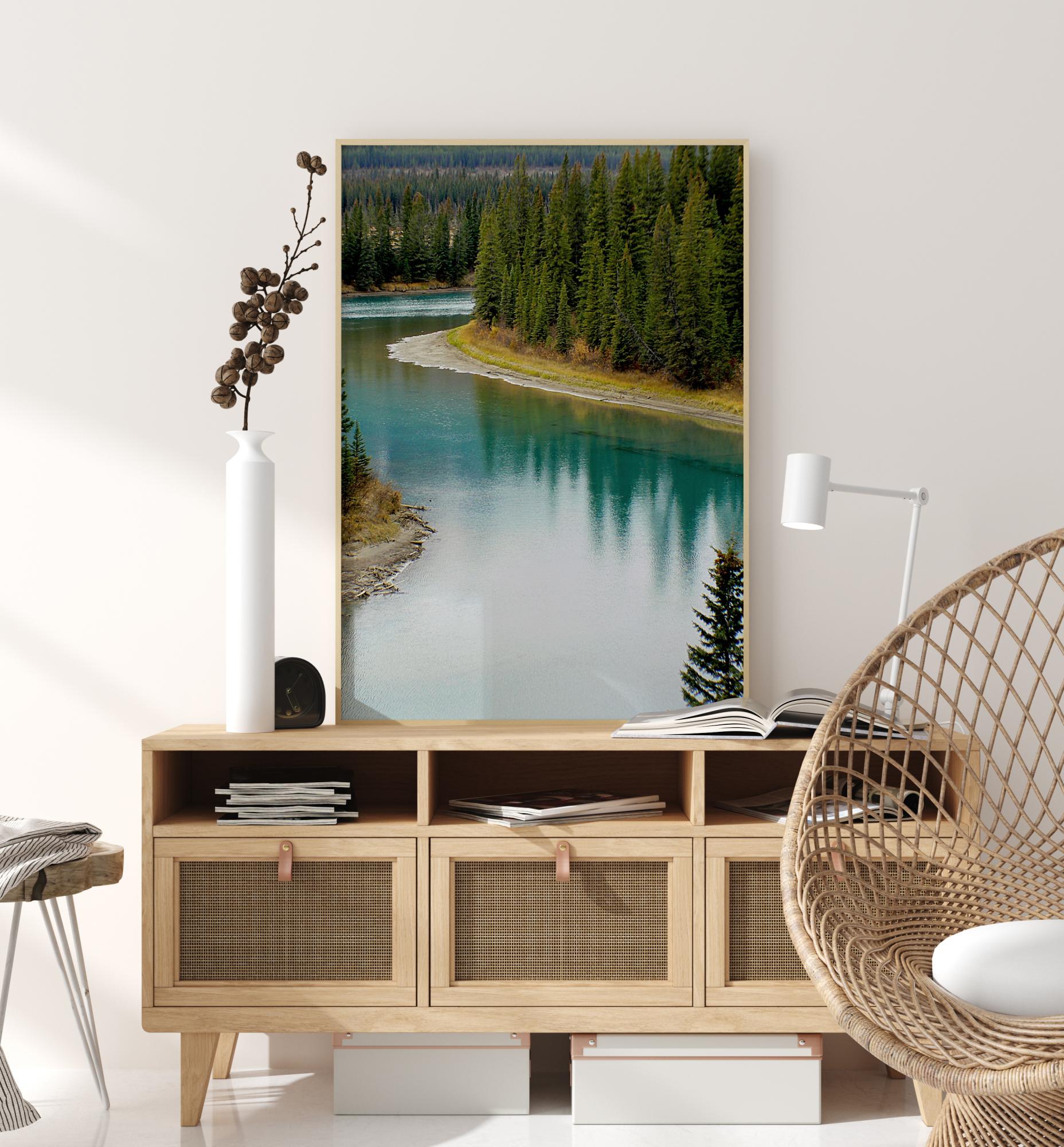 Lesní plakát, kde smrky lemují břeh široké řeky, která se vine venkovem. Zelené stromy stojí vysoko, když les mizí v dáli. Široká řeka je téměř duhově zbarvená a zachycuje ostré, špičaté odrazy stromů na svém povrchu.