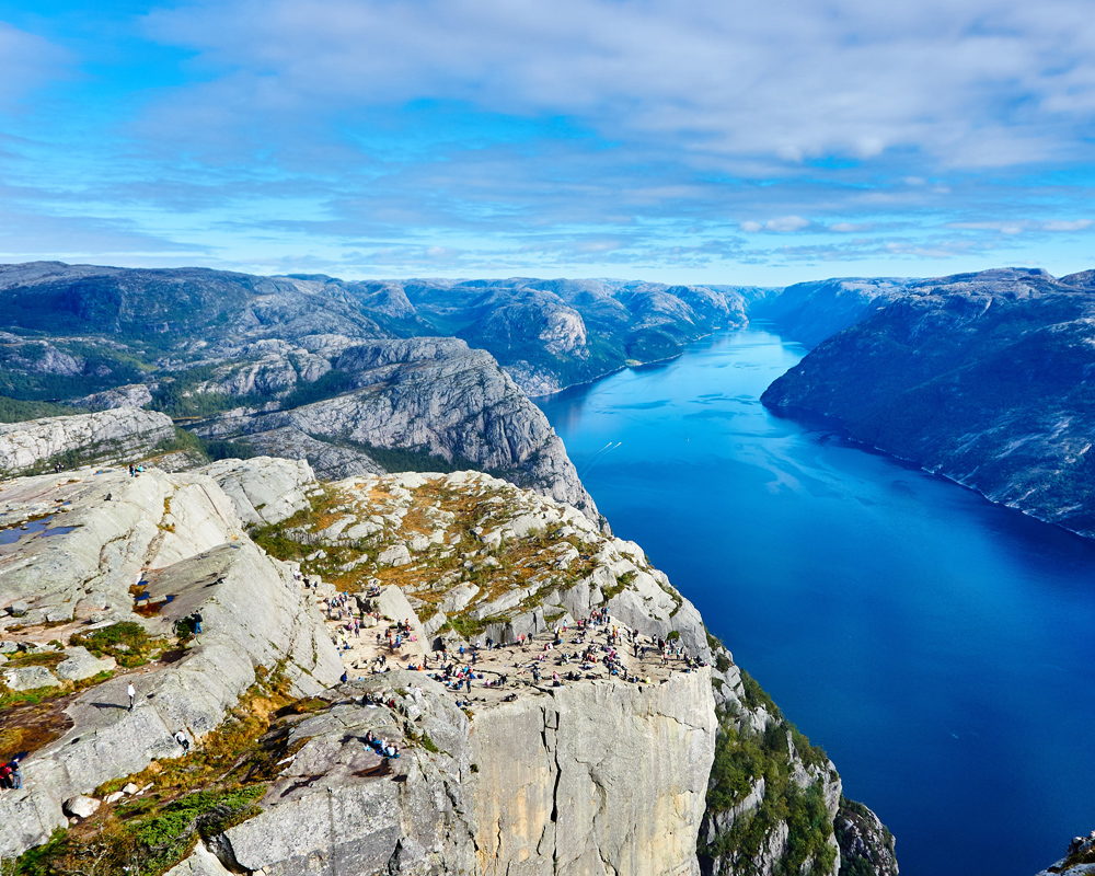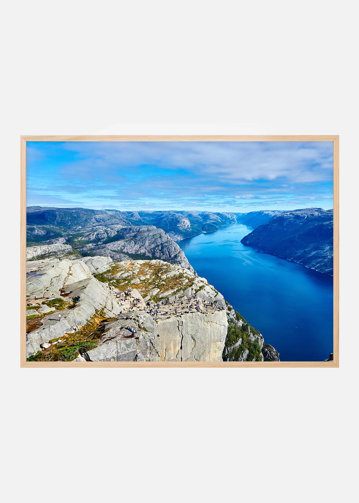 Fotografie s úchvatným výhledem do hlubokého fjordu. Plakát má odstíny mořské modré s oslněnými holými skalami na obou stranách fjordu, velkolepá krajina, která se hodí na zeď pro ty, kteří ocení krásnou přírodní scénérii. Doplňte obraz rámem, který zdůrazní motiv.