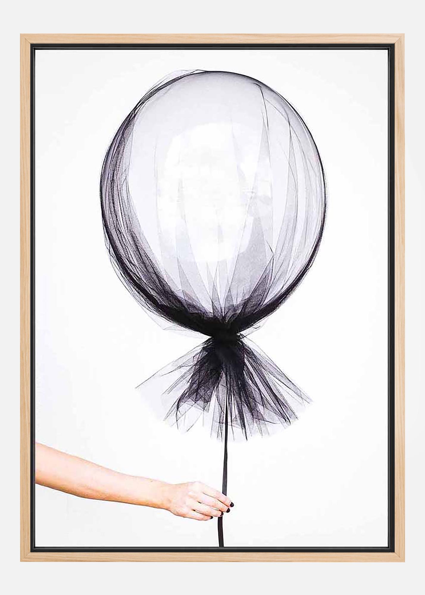 Stylové fotografické umění ruky držící vznášející se balónek zabalený v tenkém průhledném plátně. Okouzlující plakát, který vyzařuje nádhernou směsici nenuceně hravého a jemného a křehkého. Vhodný jak do dětského pokoje, tak do moderního domova.