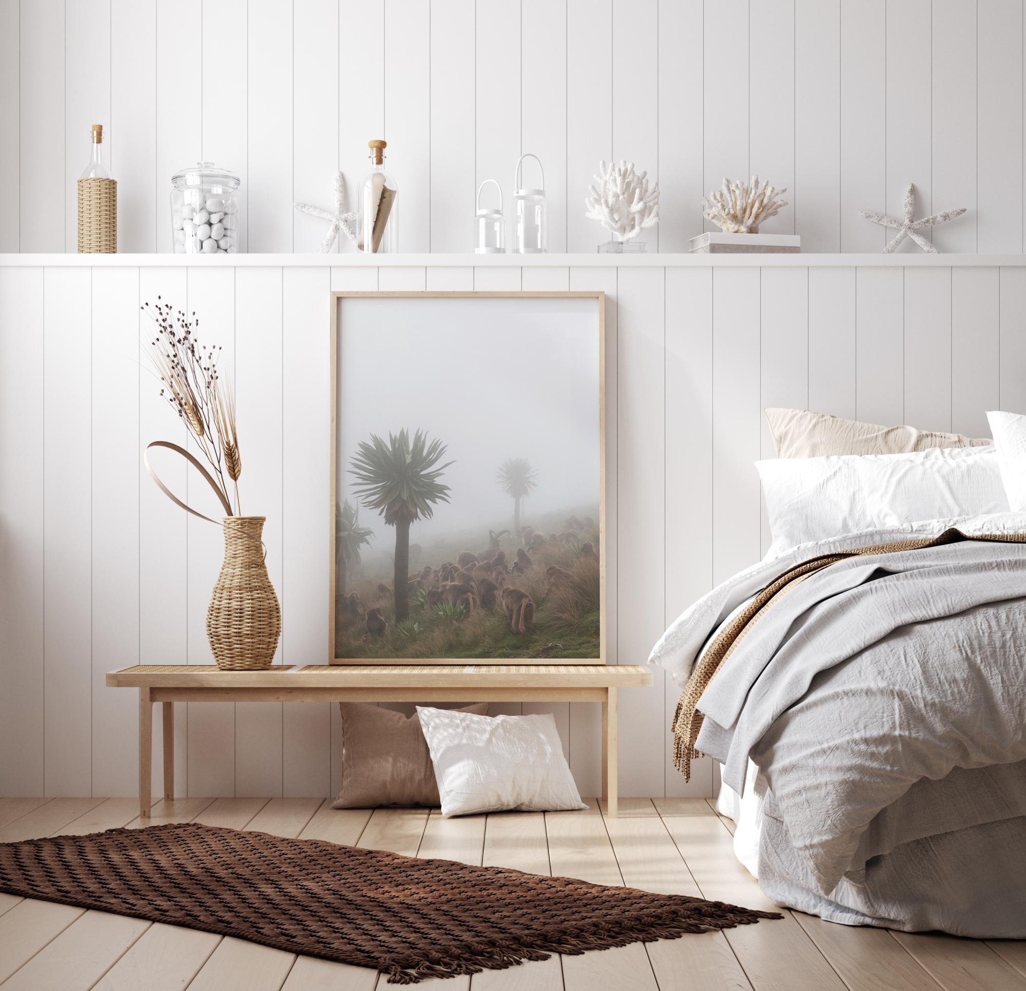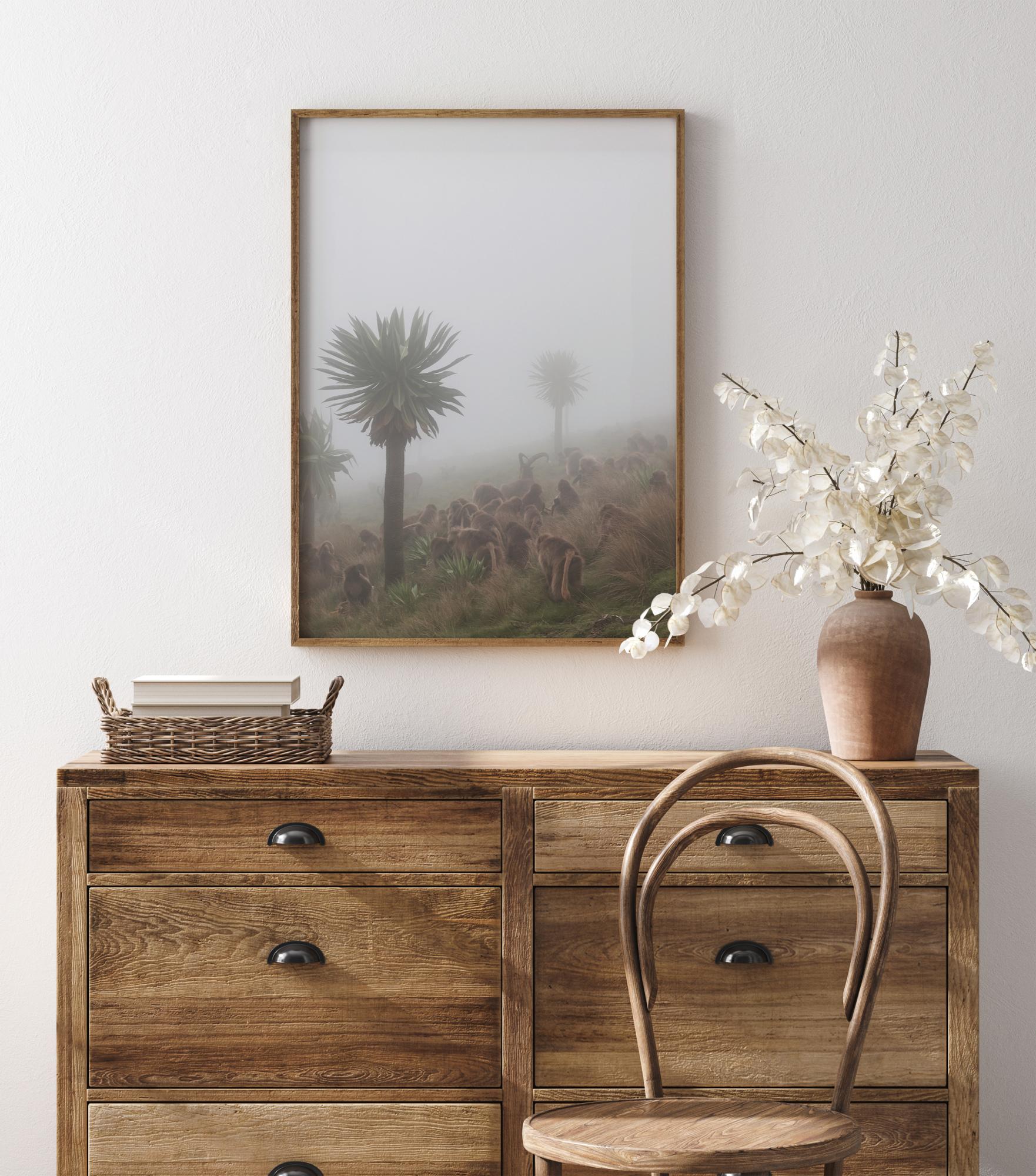 Plakát se skupinou paviánů a osamělým kozorohem uprostřed nich. Tato skupina zvířat sedí na mlhavém horském svahu s různými stromy, které se táhnou vzhůru. Scéna je klidná a pokojná, když tato zvířata odpočívají během dne.