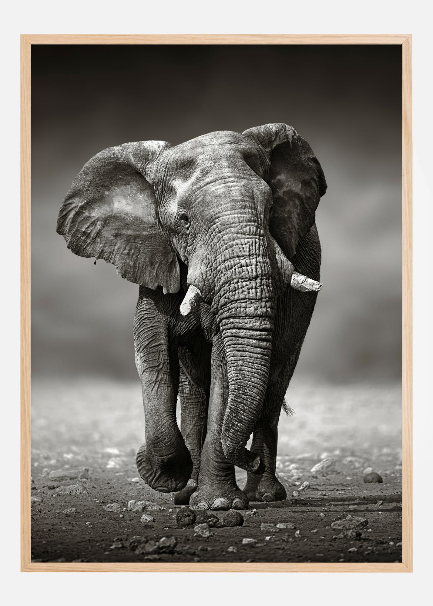 Velkolepý plakát se slonem v černobílé. Slon je uprostřed kroku, když se pohybuje směrem ke kameře. Vypadá mladě s krátkými bílými kly a klidným výrazem ve tváři. Navštivte Afriku, když obdivujete tento obraz, když visí ve vašem domově.