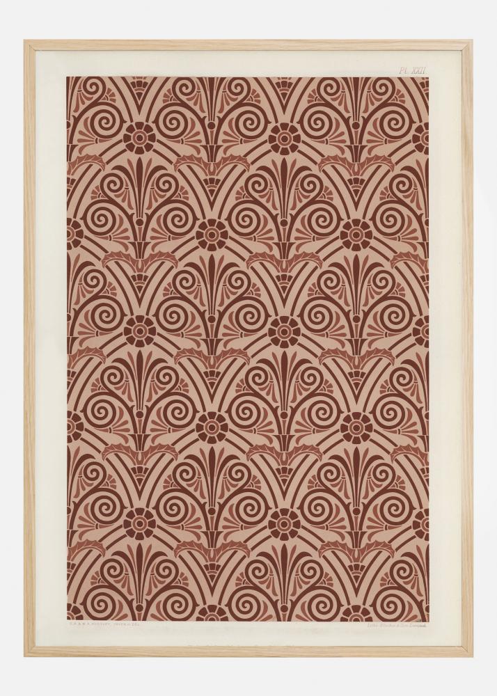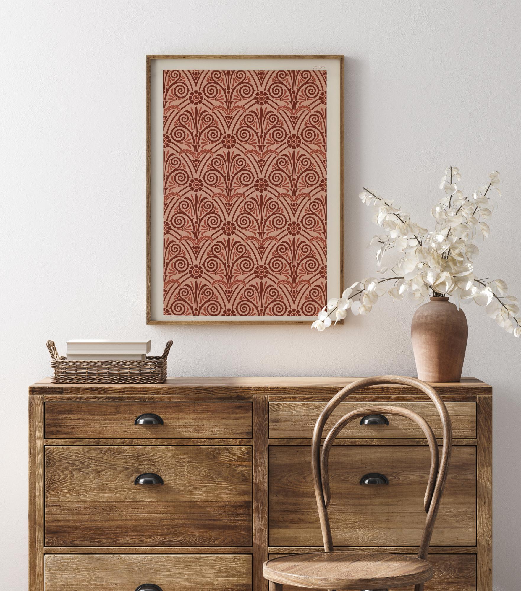 Světlý vzorovaný plakát s červenými opakujícími se vzory. V rámci vzorů se nacházejí zkroucené kruhy, které vypadají jako listy nebo třásně. Jsou tam také květinové tvary v pravidelných intervalech, což z něj činí botanický potisk. Perfektní na tapetování, podívejte se, jaké obrazy vidíte v těchto složitých vzorech.
