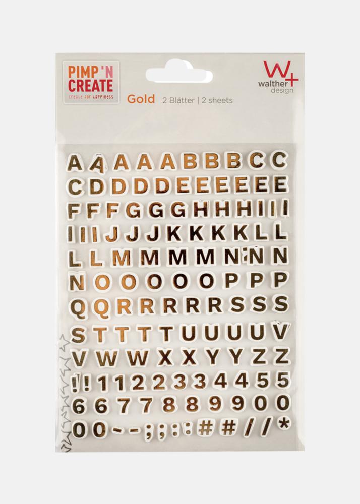 Písmena jsou vysoká 1 cm a mají elegantní design ve zlaté barvě. Balení obsahuje 2 listy se 126 písmeny, číslicemi a speciálními znaky.