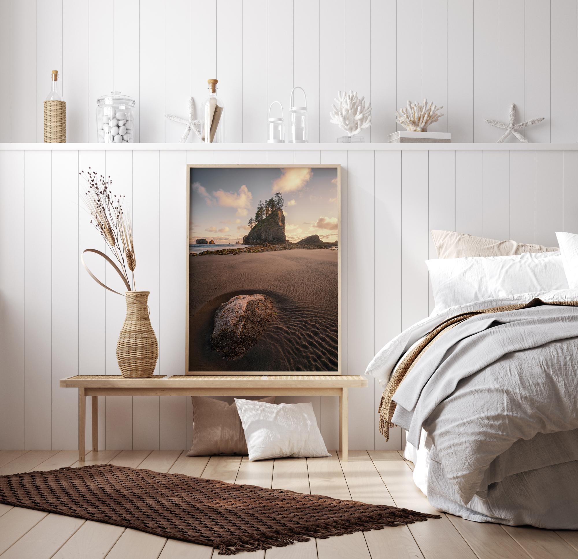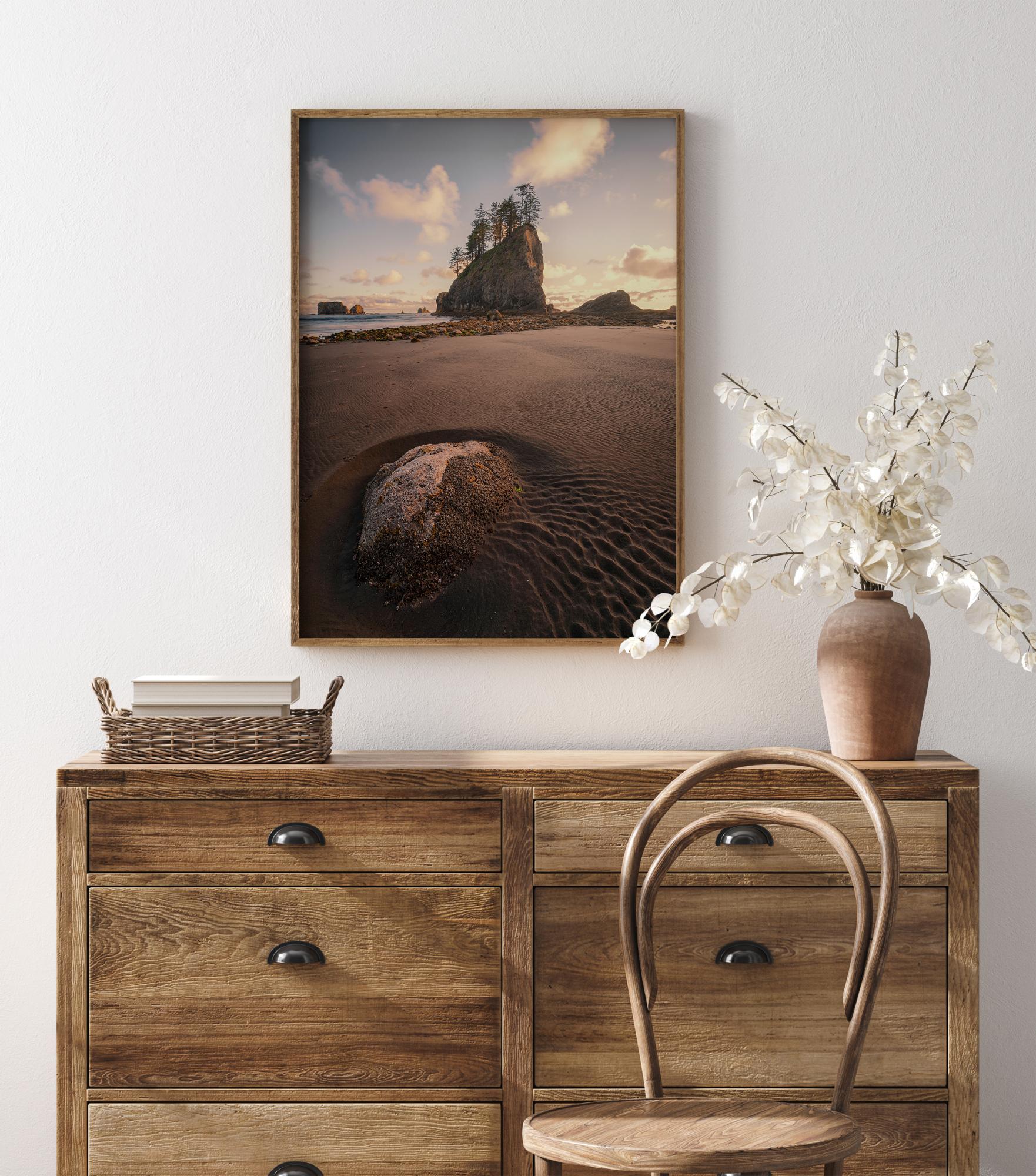 Scénický plakát s detailním záběrem pláže. Nízký úhel vám umožní přiblížit se k písku, kde můžete sledovat stopy vody vytvořené z vodní nádrže. V dáli se z moře zvedá stromem porostlá skála směrem k jemně modré obloze plné načechraných bílých mraků.