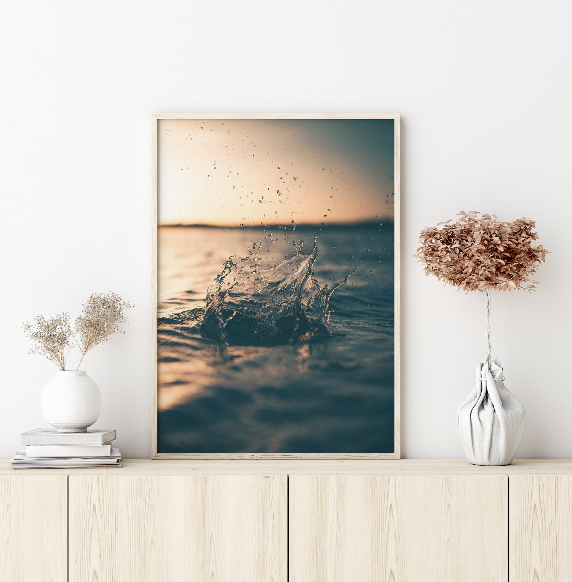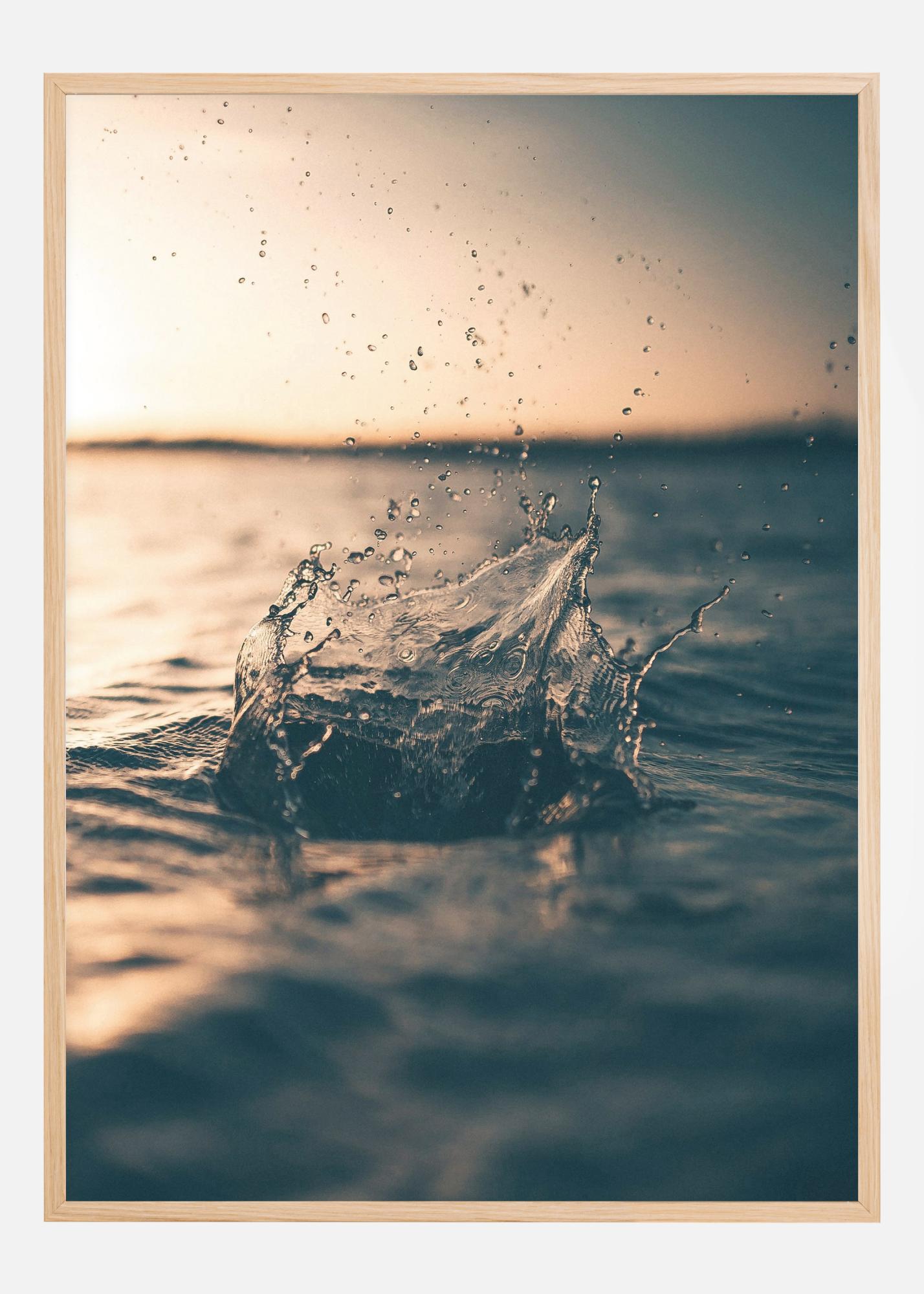 Detailní plakát zachycující následky pádu předmětu do kaluže. Okraje stříkající vody naskakují a vytvářejí malé kapky ve vzduchu. Slunce svítí zleva a osvětluje scénu, přičemž zachycuje stříkající vodu, jak stoupá. Je to fascinující obraz.